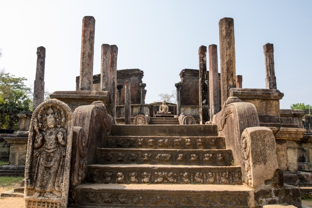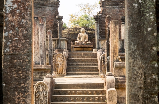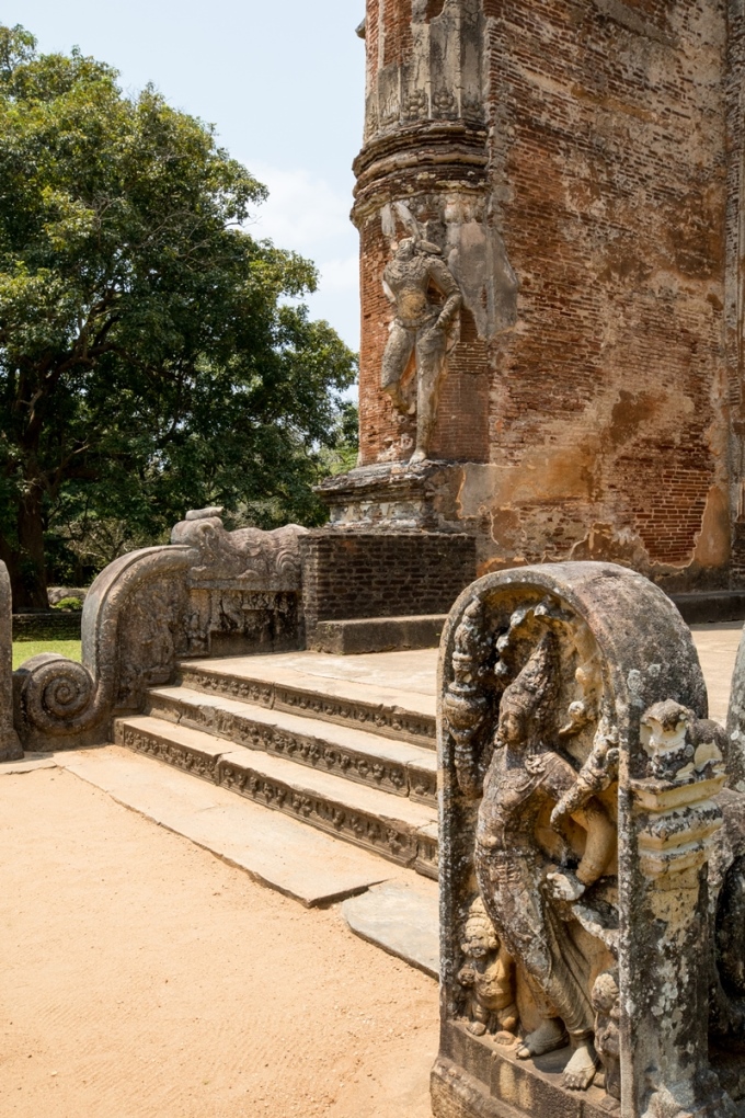 On récupère un vélo à l’entrée du site et on file sur les allées, tantôt pavées tantôt sableuses qui traversent ce lieu historique, sorte de citadelle fortifiée. Guide touristique dans la poche, on découvre les spécificités des architectures bouddhistes et hindouistes au fil des arrêts. On apprécie particulièrement le secteur du Quadrilatère, son vatadage circulaire et ses bas reliefs étonnament bien conservés arborant lions, éléphants et divinités.
