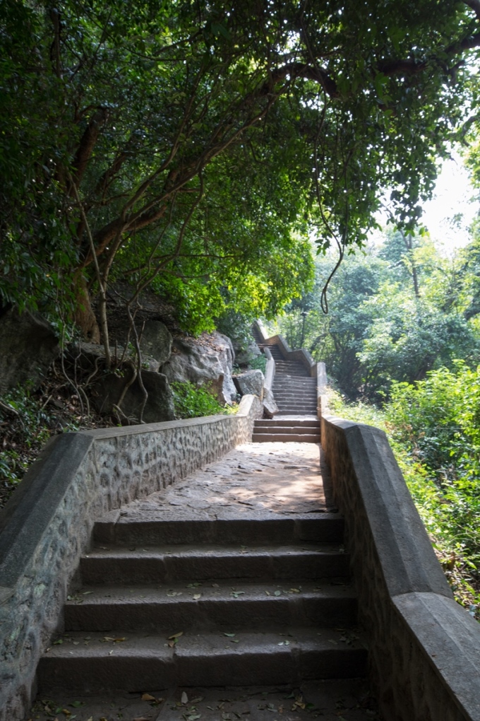 Chin nous dépose au pied d’un grand escalier de pierres grises qui grimpe vers la partie ancienne, face à une école bouddhiste où des hommes de tout âge ont revêtu la traditionnelle tenue orange. Dans une atmosphère moite et un peu grisonnante, on se lance donc dans une nouvelle ascension. Sur le chemin, les arbres s’agitent au passage des macaques venus guetter les encas des touristes et les offrandes des locaux.