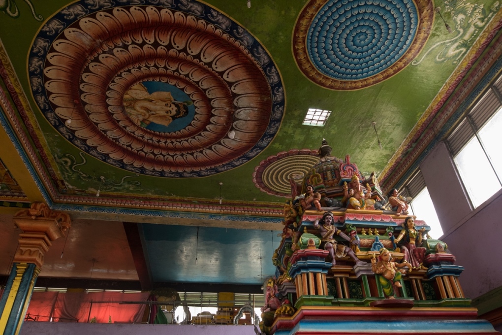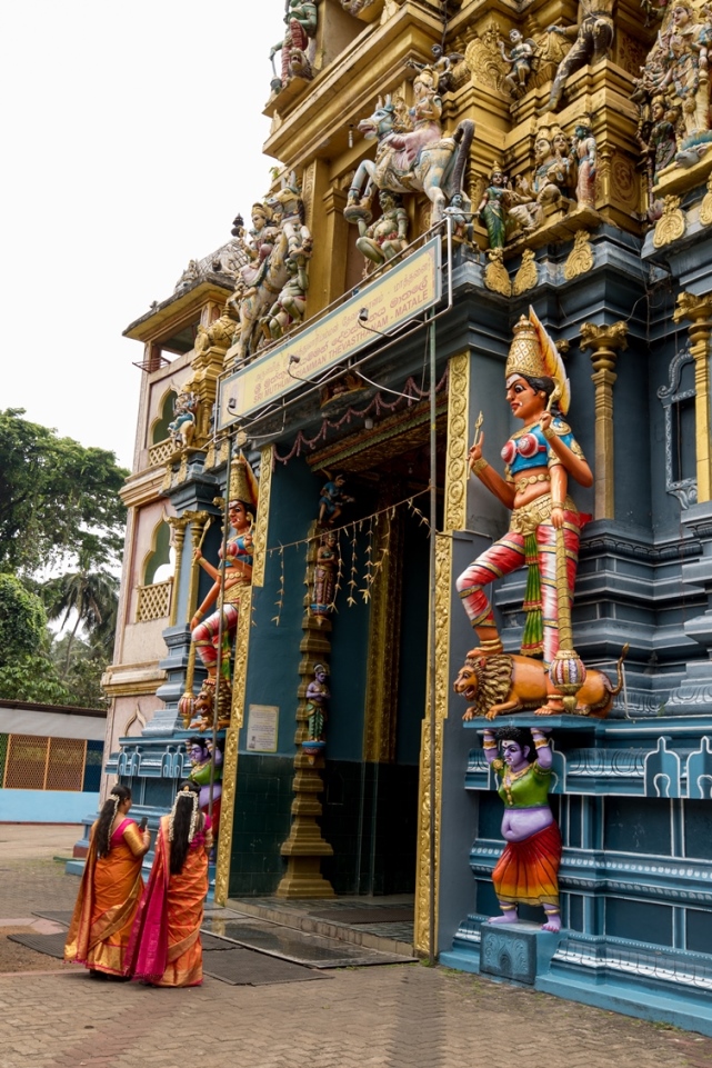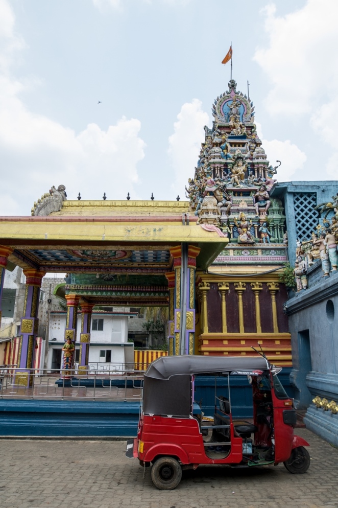 Après cette plongée dans l’histoire bouddhiste, on poursuit notre route vers Kandy avec un nouvel arrêt, dans un temple hindouiste cette fois. Le Sri Muthumariamman Thevasthanam est notre première rencontre avec cette religion. L’extérieur est déjà une révolution.