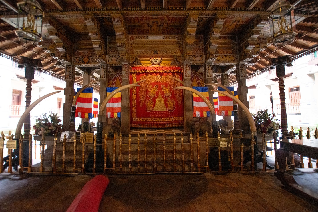 La cité royale, bordée de douves, abrite surtout le Temple de la Dent, lieu de culte et de pèlerinage pour un grand nombre de fidèles. Une atmosphère curieuse se dégage de ce sanctuaire sur deux étages majoritairement constitué de bois. Il abriterait en effet une dent de Bouddha, partie d’Inde vers Ceylan cachée, selon la légende, dans les cheveux d’une princesse. Il règne donc dans ses murs une ferveur toute particulière. Les tables d’offrandes croulent sous les fleurs, dégageant un parfum entêtant à l’étage supérieur. Face à tant de ferveur et de recueillement, on n’osera pas prendre des photos, préférant laisser aux fidèles leur moment sans être dérangé.