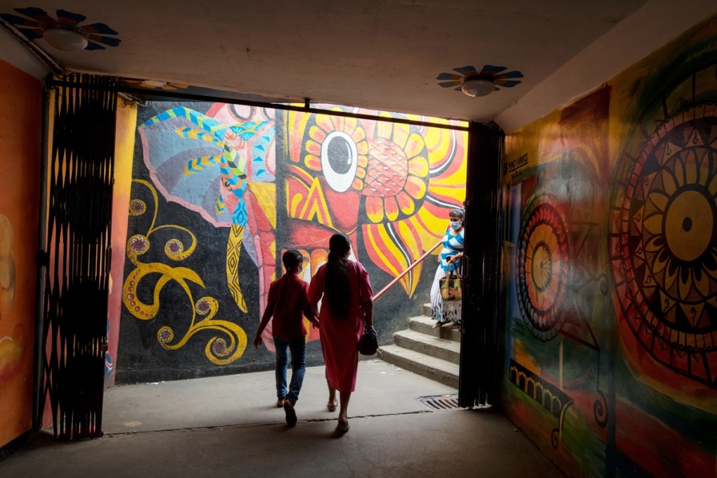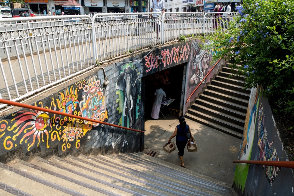 Avant de quitter la ville, on remonte l’artère principale à la recherche d’une boulangerie, bien décidés à tester quelques spécialités locales. Partis à la recherche d’un moyen sûr de traverser l’avenue, on tombe sur un tunnel aux multiples fresques de street art. J’ai un vrai coup de cœur pour ces allées colorées, couvertes de masques traditionnels et d’éléphants.