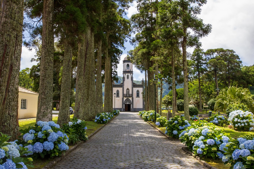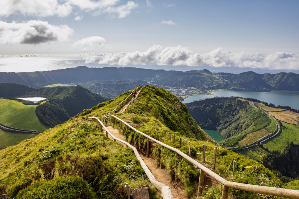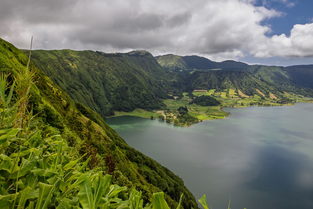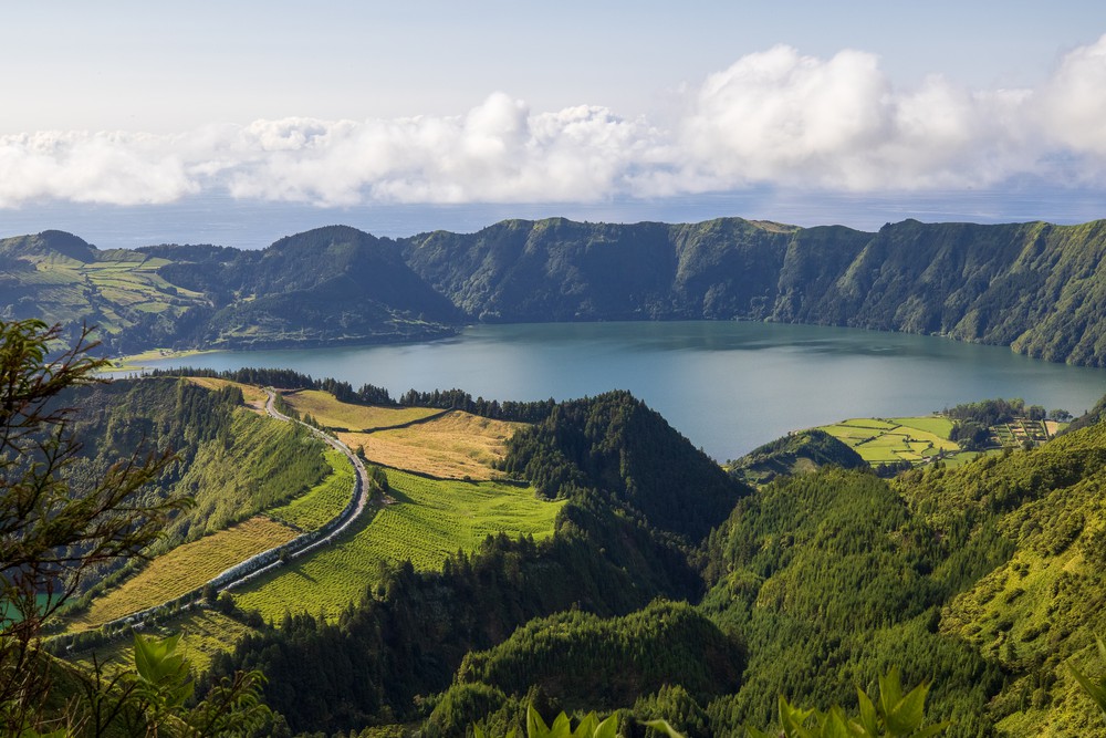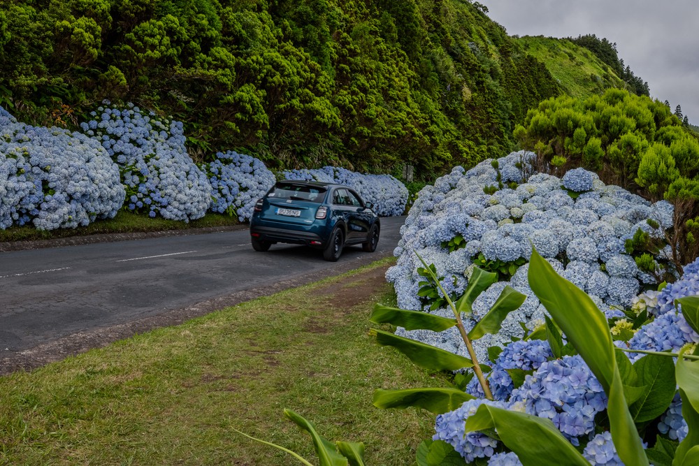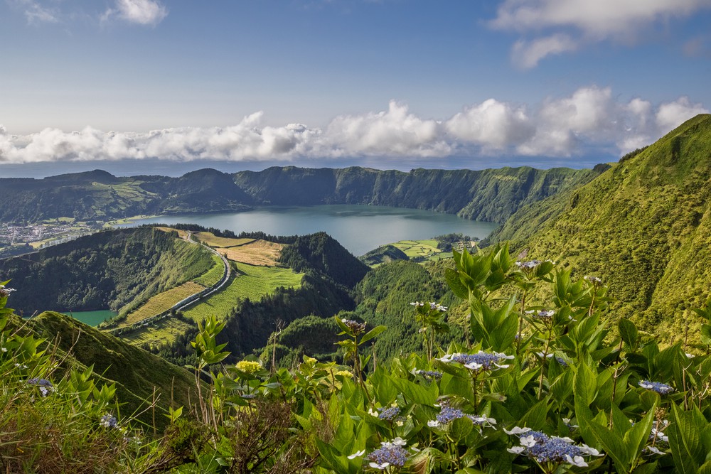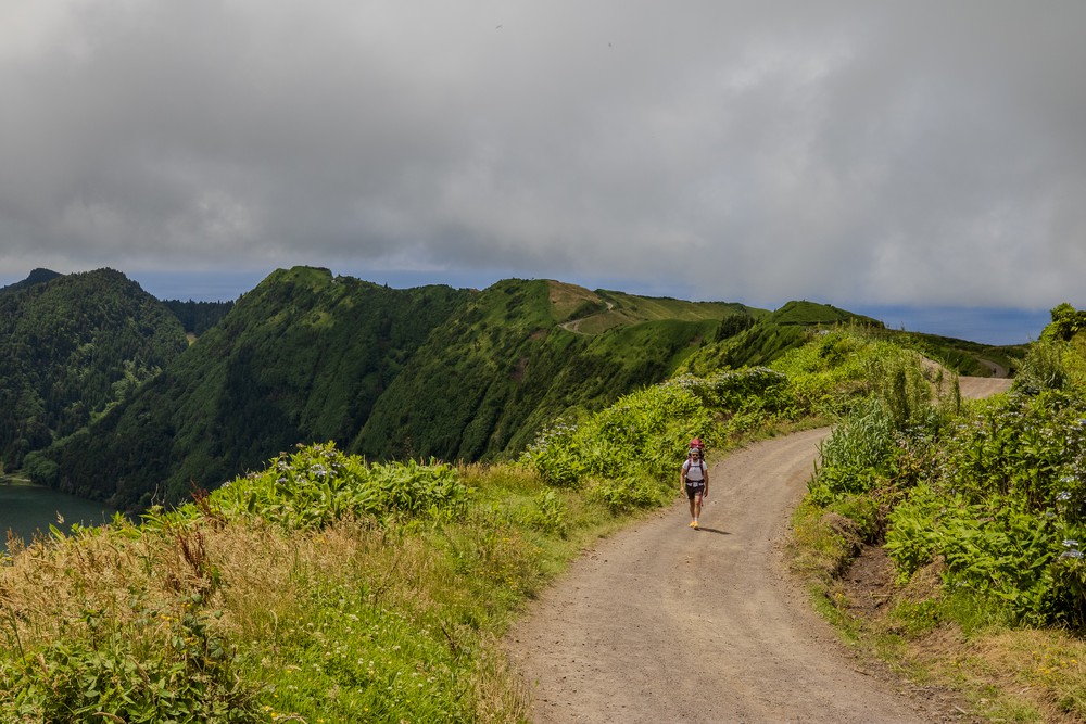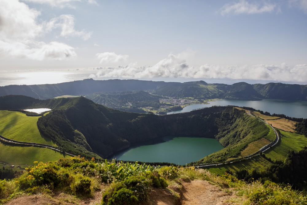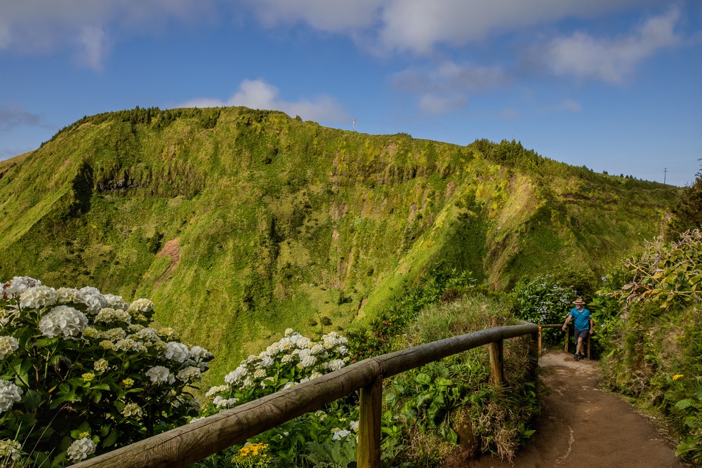 La lumière du soleil se reflète si fort sur l’océan que l’eau semble blanche derrière les murs verdoyants du cratère. Au bout du sentier, la vue s’ouvre sur la route empruntée tout à l’heure, habillées d’impressionnants murs d’hortensias. Les lacs affichent leurs nuances de couleurs entourés de champs et de falaises. D’ici, les dimensions de la caldeira impressionnent vraiment. On y reste un long moment pour profiter des lieux, à peine dérangés par quelques promeneurs.