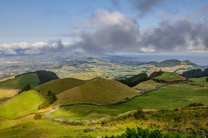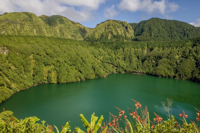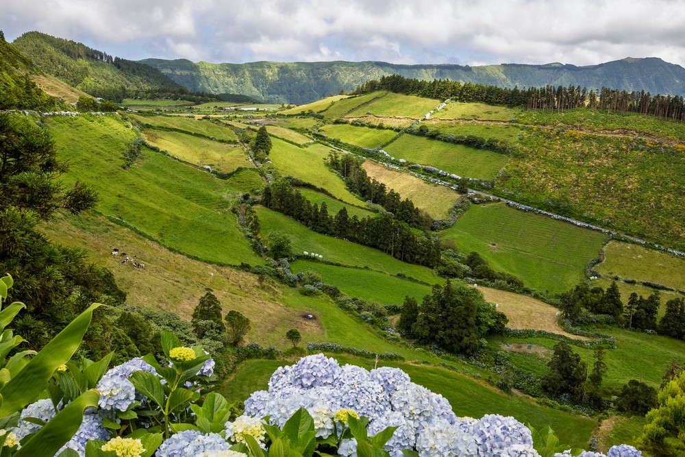 Il faut dire qu’on pourrait presque ériger ce micro-environnement au rang de merveille naturelle. Y pénétrer revient à avancer au cœur d’un volcan endormi dont les parois intérieures sont recouvertes de milles nuances de vert, ponctuées du bleu des hortensias. Sur les parois extérieures du cratère, on trouve plutôt des pâturages colorés et ondulants, habités d’un nombre incroyable de vaches.