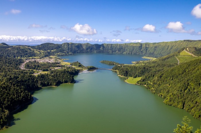 La légende raconte d’ailleurs que leur origine est tragique. ils se seraient en effet formés à partir des larmes d’une princesse aux yeux bleus et d’un berger aux yeux verts pleurant sur leur amour impossible. La réalité est moins romantique : il s’agit d’un seul grand lac aux différences de profondeur et de concertation d’algues !
