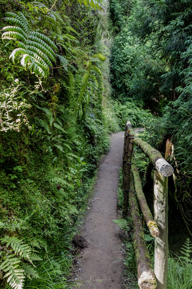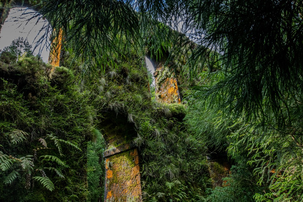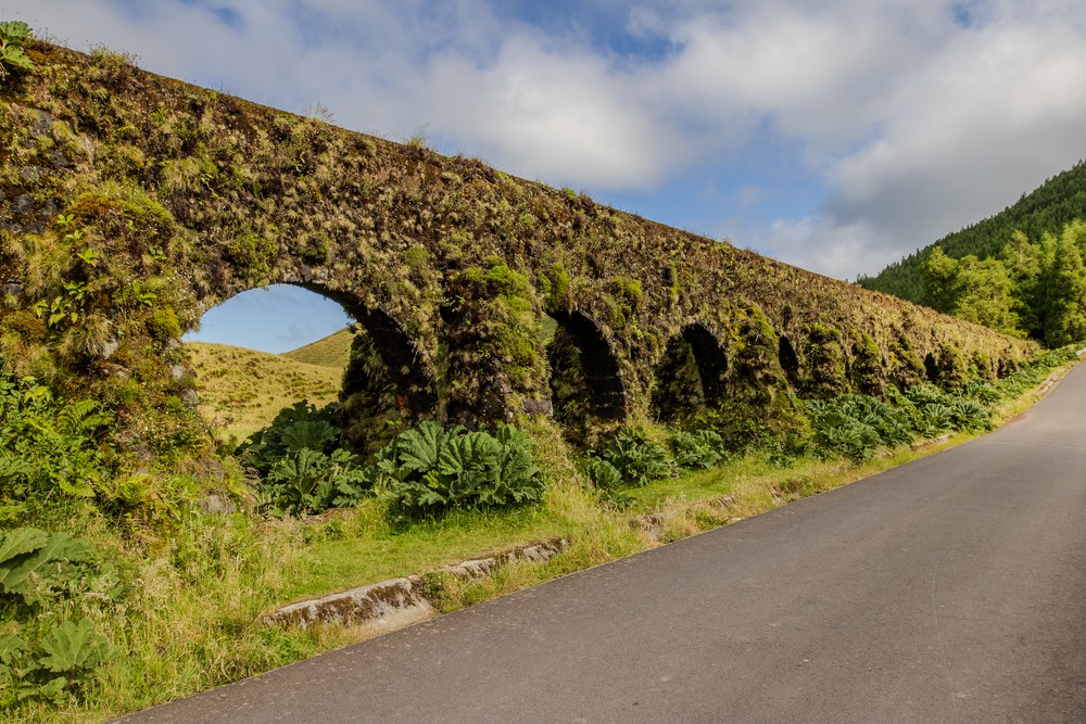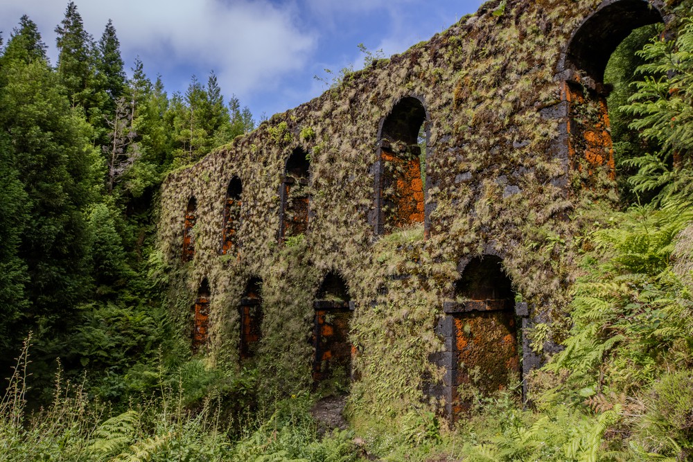 En repartant, et malgré l’heure déjà un peu tardive, on s’autorise un petit détour vers l’aqueduc Do Carvão, vestiges d’une époque où l’alimentation en eau de l’île dépendait de la caldeira. Un peu éloigné de la route principale, on en trouve plusieurs morceaux bien visibles. J’ignore pourquoi j’ai toujours eu une sensibilité pour les vieilles pierres couvertes de végétation mais cet endroit me charme tout de suite. Mousses, fougères et petites fleurs ont depuis longtemps gravi la pierre et reprennent peu à peu leur droit sur un bout de civilisation. Derrière la plus grande pièce restante (le muro das nove janelas), une forêt sombre paraissait accessible par un petit chemin. Pris par le temps et n’ayant aucune idée de la longueur du sentier, nous ne nous y sommes pas aventurés. On ne peut que vous conseiller de garder un peu de temps pour explorer ce coin coupé du monde.