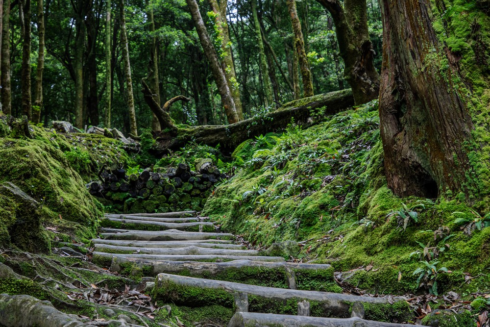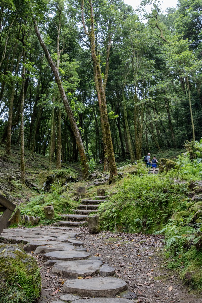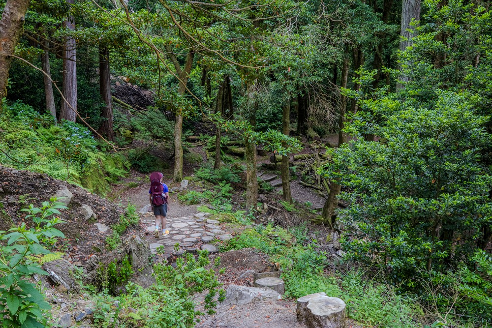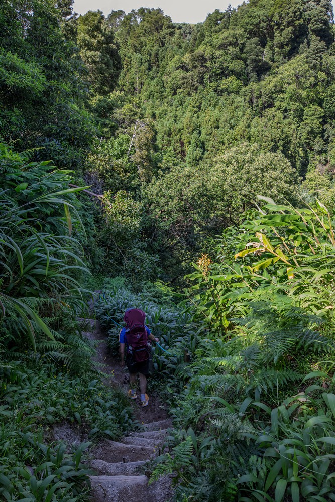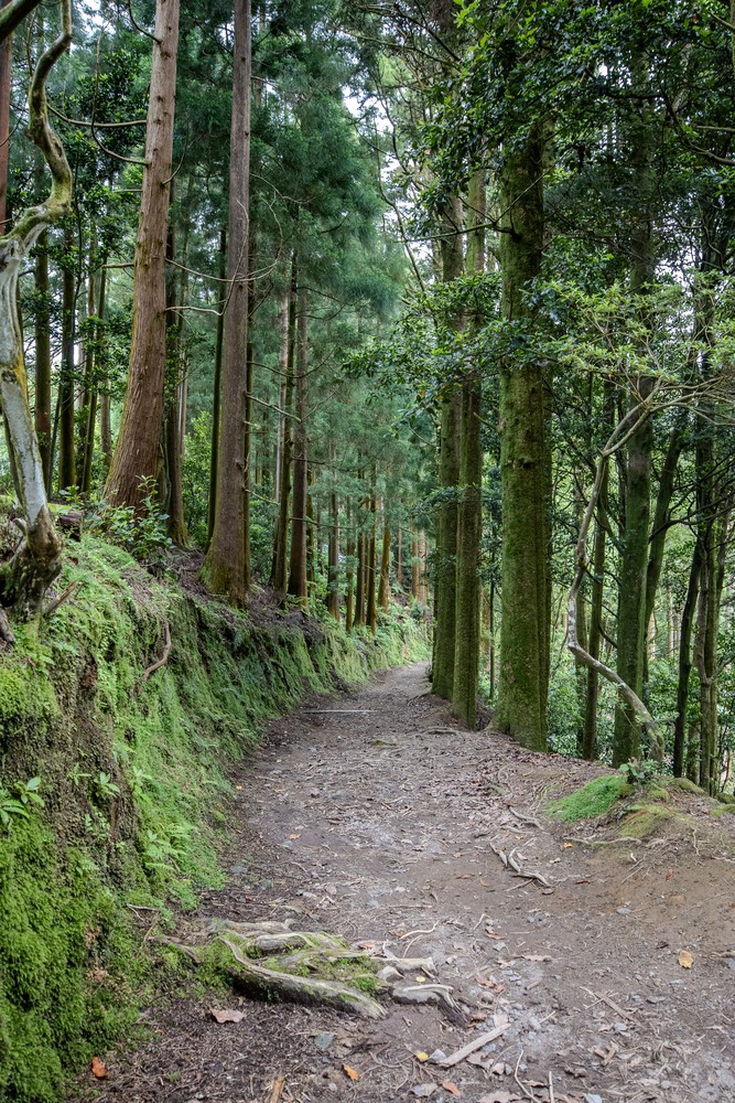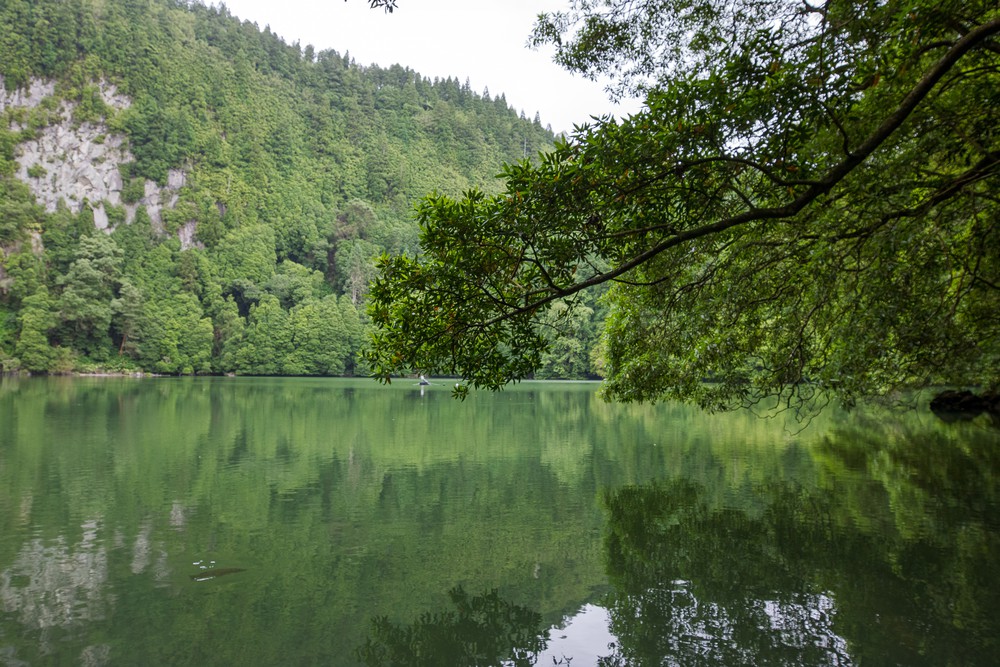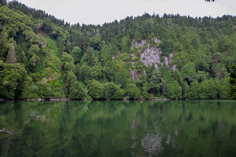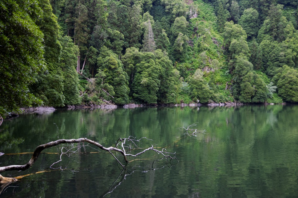 Par la fenêtre de la voiture, on observe un temps grisonnant accompagner les kilomètres qui défilent vers le centre de l’île. Après un peu de route, on s’arrête, seuls, dans un parking au milieu de la forêt avant de nous engager à pied sur une étroite route de terre. Distraits, on commence par rater le sentier qui descend au Lagoa Do Congro, un peu perdu au milieu d’un chantier d’aménagement. Une fois celui ci retrouvé, on s’enfonce sous une pluie fine dans un univers verdoyant créé au creux d’une profonde dépression presque ronde, comme un cratère. Les abords du chemin tout en descente ne sont que mousses, terre et branches d’arbres. Dans cet univers humide, il n’y a quasiment pas un bruit.
