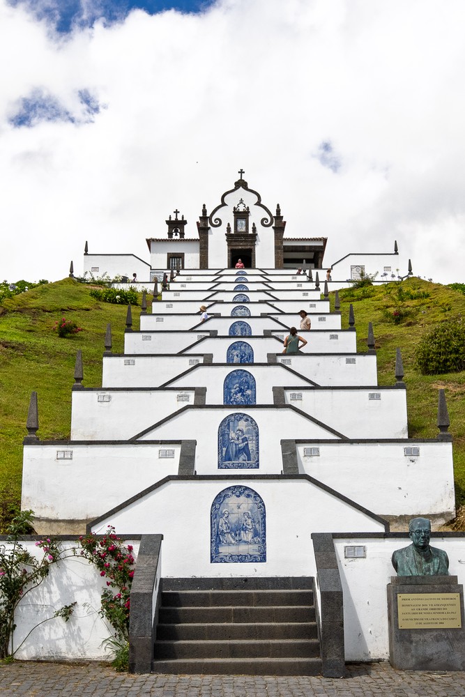 La chapelle Nossa Senhora da Paz, l’escalier sacré des Açores, est, elle, nettement plus animée. Avec sa façade blanche rehaussée de pierres de lave noire, elle fait figure de carte postale. Son architecture particulière, avec son escalier en paliers, représente neuf étapes ou mystères de la vie du Christ. Au sommet, le palier final s’ouvre sur une petite esplanade pavée qui offre une vue panoramique sur le décor.
