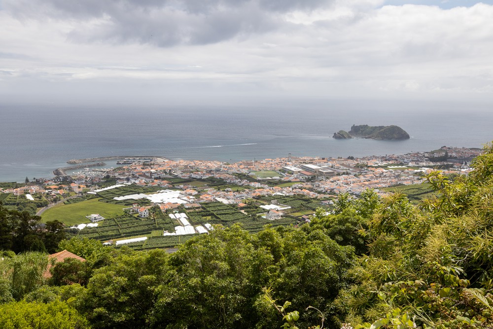 On y aperçoit les serres d’ananas avec leurs toits blancs, les villages de bord de mer mais aussi l’îlot de Vila Franca Do Campo : un ancien cratère effondré devenu piscine naturelle, aujourd’hui classé réserve naturelle. Des excursions permettent de s’y rendre pour quelques heures ou pour la journée, surtout pour y pratiquer la plongée ou le snorkeling. Nous avons cependant laissé passer l’expérience, peu pratique avec un bébé.