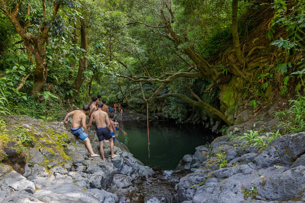 Au bout du chemin, deux points de baignade sont accessibles après quelques acrobaties. D’abord le Poço dos Trinta Reis, où tous les ados du coin se sont donnés rendez vous pour une session de sauts, puis la la casacata do segredo qui coule doucement sur un mur végétal bordé d’eaux bleutées. Les derniers mètres du chemin aboutissent dans un village tranquille aux maisons blanches et au nombreux chats se dorant la pilule sous les derniers rayons du soleil de cette fin d’après midi, visiblement habitués au passage des promeneurs.