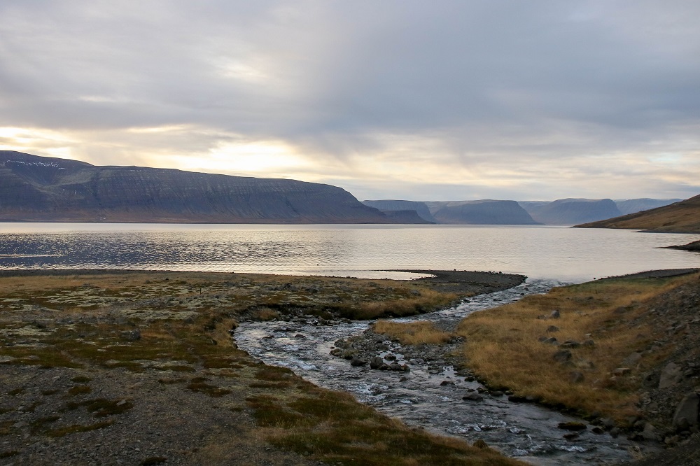 Après mille précautions lors de la descente, on arrive finalement au niveau de Hrafnseyri où quelques maisons aux toits de verdure bordent la route. Au fond du fjord, une centrale électrique nous offre un parking bien pratique pour s’approcher de l’eau et observer les phoques tout près des berges. Encore quelques kilomètres et Fjallfoss apparait en contrebas de la route.