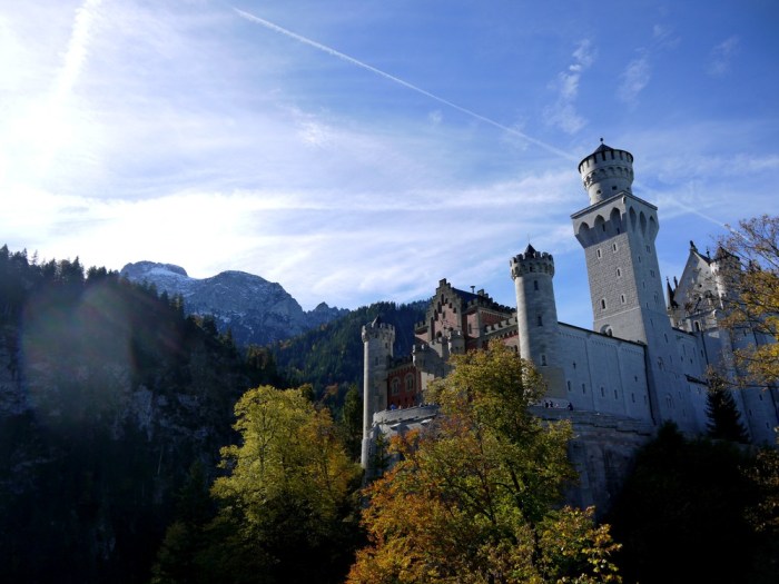 Le château du Neuschwanstein apparait finalement entre les arbres. Loin du reste des touristes, nous optons pour un chemin qui grimpe dans la forêt avant de rejoindre la demeure de Louis II. Si certains choisissent de partir en courant, les photographes trainent à l’arrière pour admirer le jeu de couleurs, les lacs et les montagnes que l’on aperçoit entre les troncs d’arbres.