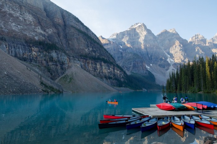 (Banff NP) Armés d’une tartine et d’un appareil photo, au pied du grand hôtel, on guette le lever du soleil sur les parois rocheuses saupoudrées de neige à l’autre bout du lac. Dans le ciel sombre, un aigle pêcheur tournoie lentement au dessus des eaux turquoises et glacées. Sur la rive ouest, le petit chalet de location de canots ponctue le décor de quelques tâches de lumière dorée.