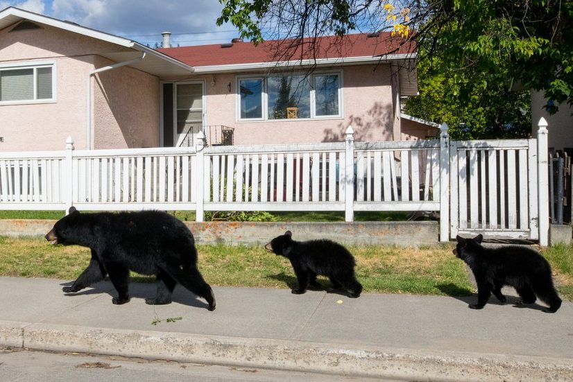 Après des jours de recherches dans les forêts, tôt le matin et tard le soir, des jours de surveillance des buissons débordant de baies, c’est finalement sur un trottoir, en pleine ville et en plein milieu de la journée que nous croiserons enfin les ours brun. En ce jour de rentrée des classes, Maman ours s’est sans doute décidée à emmener ses petits à l’école…