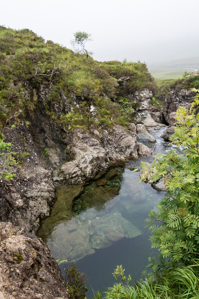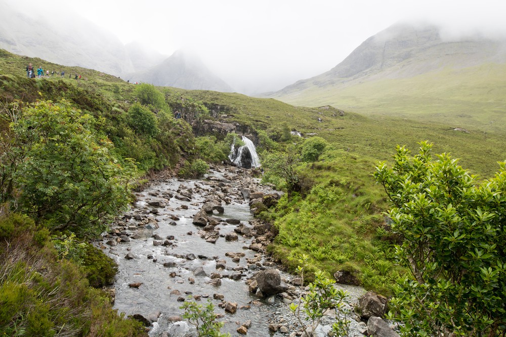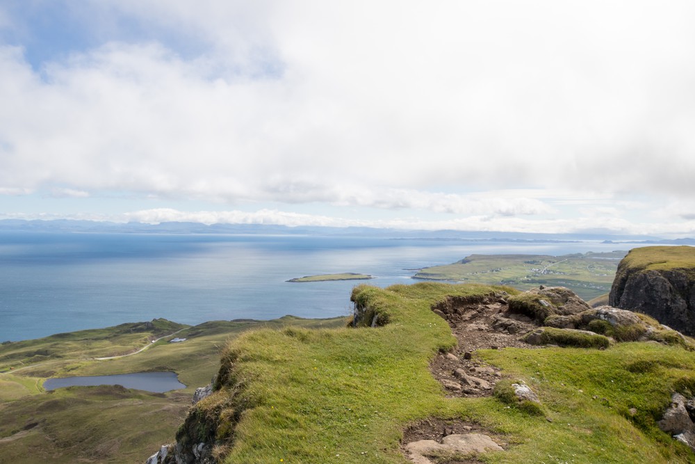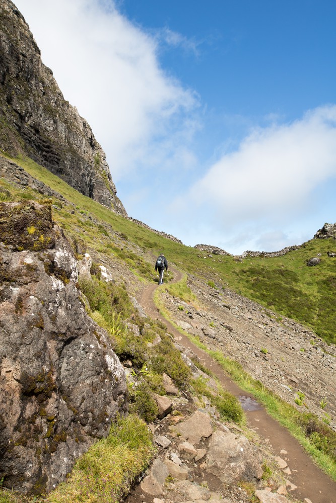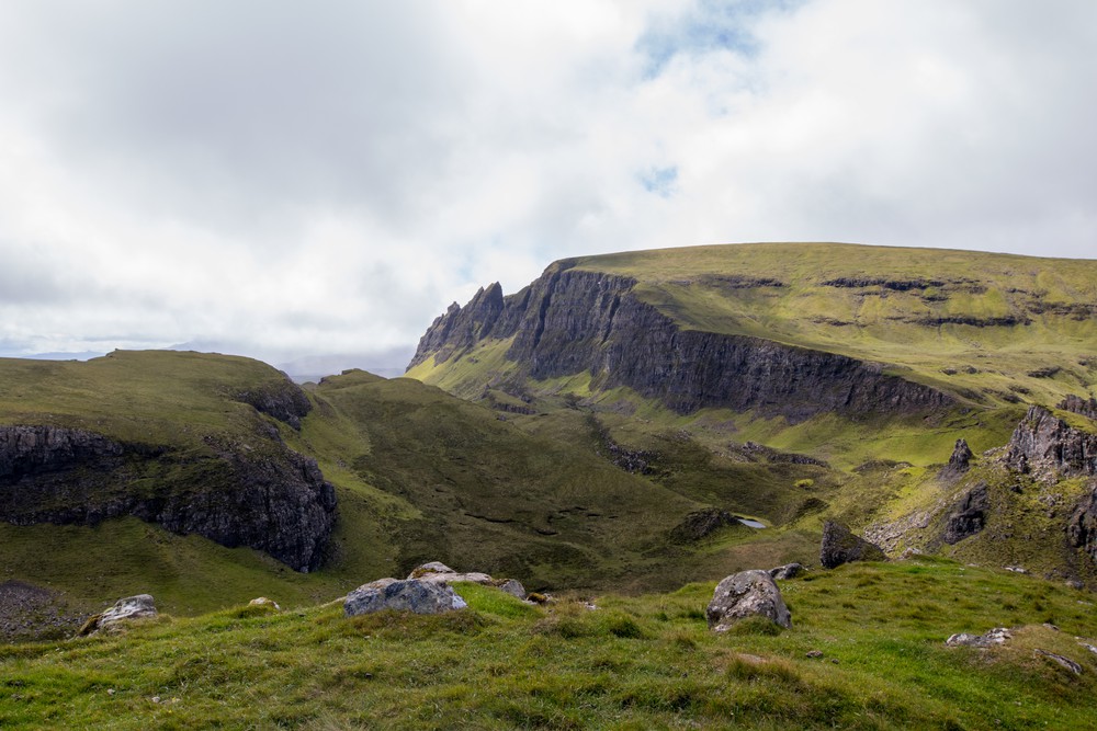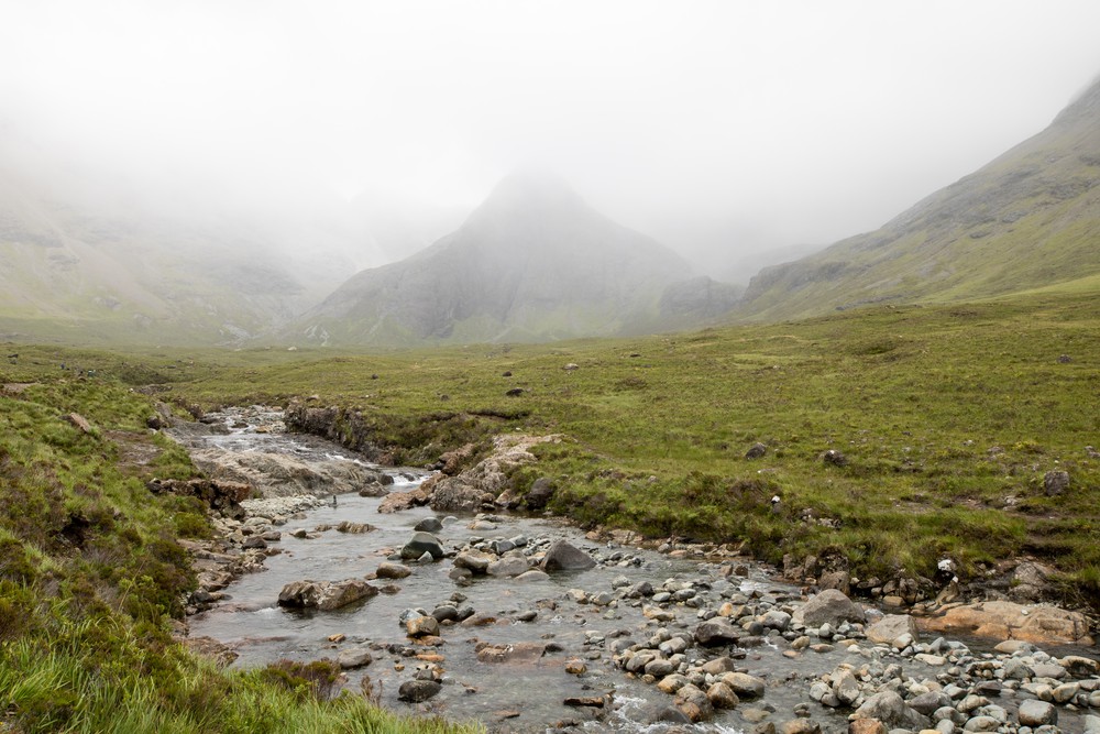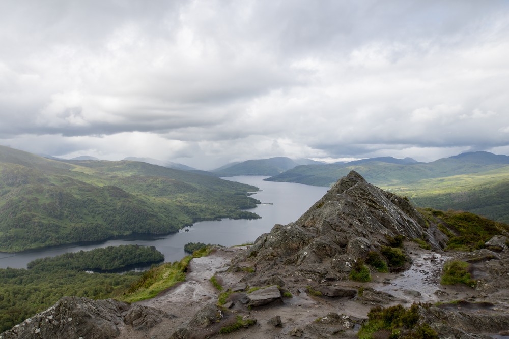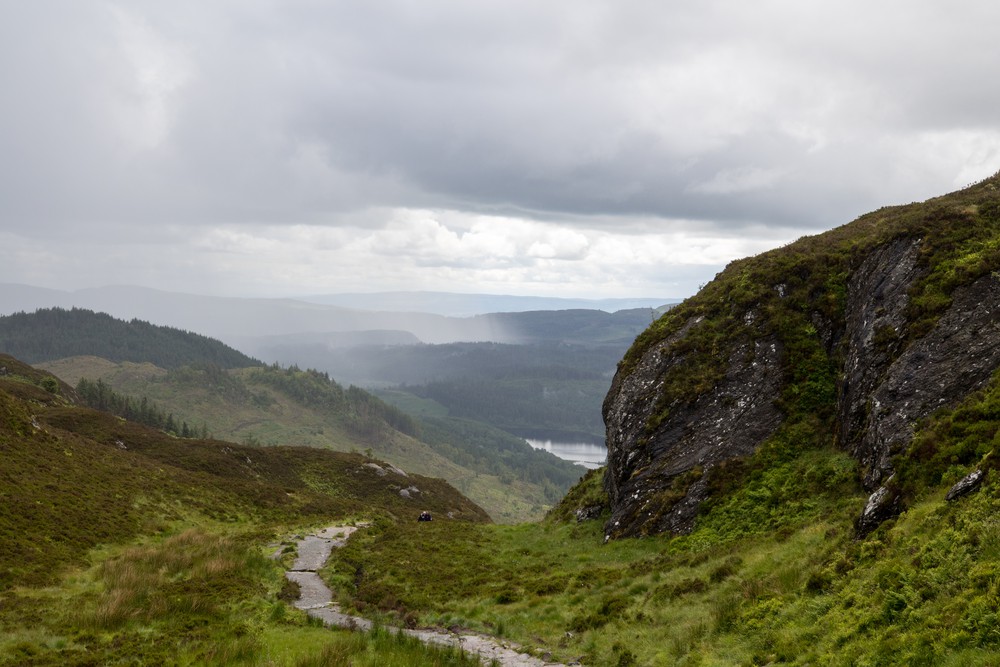 Arrivés au premier palier, l’histoire se corse. On est face à un « mur » parsemé de roches qui mène au sommet sur une distance assez courte. Un pas après l’autre, on gravit les pierres luisantes. Après deux semaines de balade, les jambes peinent un peu. L’arrivée au sommet est saluée par un ciel d’un gris sombre. Les nuages défilent au-dessus du loch, s’assombrissent puis déversent des sceaux d’eau sur nos têtes. Pourtant, le spectacle a du charme et l’atmosphère donne des couleurs particulières au paysage.