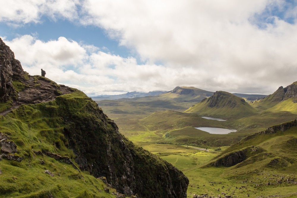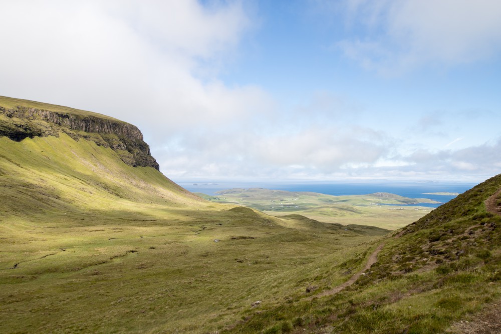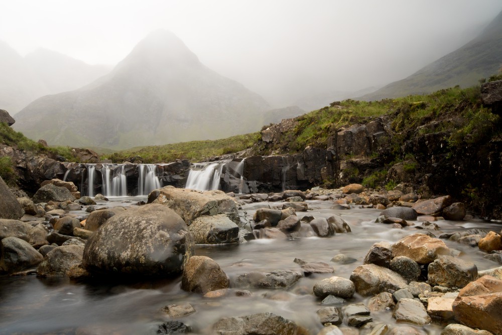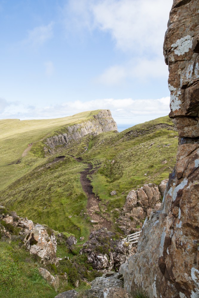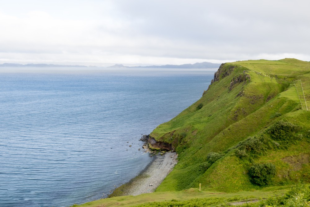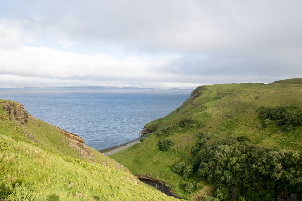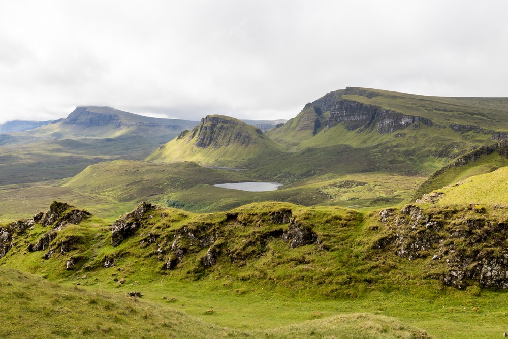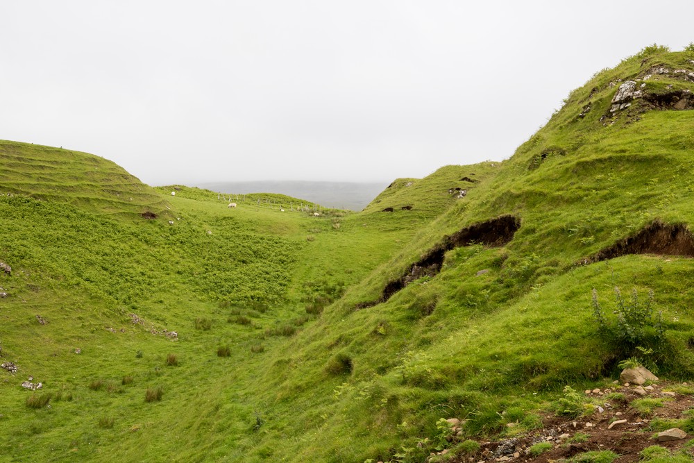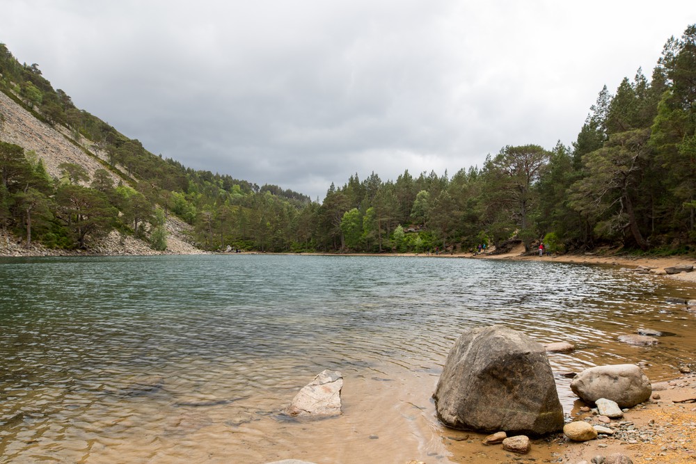 Arrivés au premier palier, l’histoire se corse. On est face à un « mur » parsemé de roches qui mène au sommet sur une distance assez courte. Un pas après l’autre, on gravit les pierres luisantes. Après deux semaines de balade, les jambes peinent un peu. L’arrivée au sommet est saluée par un ciel d’un gris sombre. Les nuages défilent au-dessus du loch, s’assombrissent puis déversent des sceaux d’eau sur nos têtes. Pourtant, le spectacle a du charme et l’atmosphère donne des couleurs particulières au paysage.