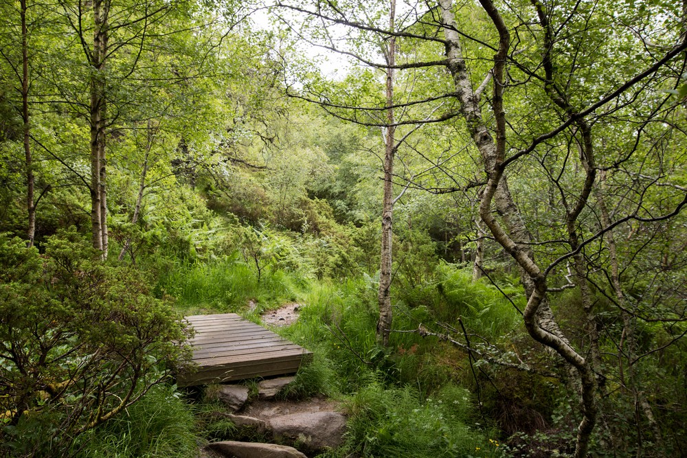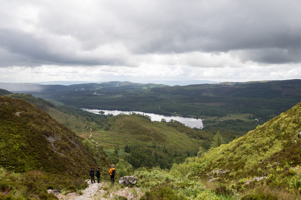 La suite de la journée est un peu plus acrobatique. On se lance en effet à l’assaut du Ben A’an, plus haut sommet local, sous un temps peu encourageant. La randonnée est relativement courte mais grimpe tout au long de l’aller. Armés de nos k-ways, on marche vers le sommet entre hautes herbes et rangées de sapins tout en jetant de temps à autre un coup d’œil en arrière sur le loch Katherine.