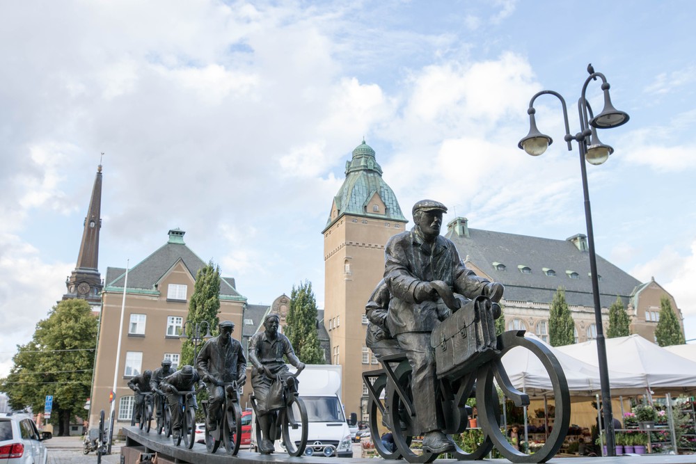 Après une première centaine de kilomètres, nous approchons de Västerås pour une pause déjeuner bien méritée. N’ayant pas le temps d’aller jusqu’au lac, on se limite au centre historique et pittoresque pour reprendre des forces. Le quartier n’est pas très grand mais avec son petit marché de baies il est l’occasion d’une balade agréable. Arrivés devant un restaurant avec terrasse au bord d’une petite voie pavée, on s’initie laborieusement au suédois (qui ne se prononce pas du tout comme il s’écrit !) avec notre serveuse qui ne parle pas un mot d’anglais. Le nez dans le dictionnaire, on déchiffre la carte avec amusement avant de craquer pour d’énormes plats de pâtes et un morceau de gâteau exposé en vitrine.