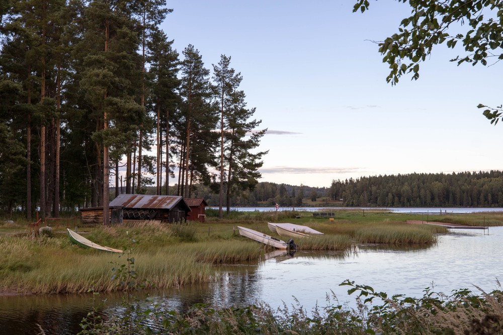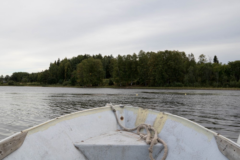 Après un bref arrêt à Mora pour une pause pique-nique en bordure du lac, seulement occupé par une multitude de canard bien décidés à partager notre repas, on file vers notre randonnée du jour, dégotée sur un site internet en chemin. Les maisons croisées dans les villages toujours plus petits semblent plus anciennes, le bois vieilli qui les composent d’un rouge plus profond. Pour la première fois, on perçoit une Suède plus profonde. On se gare au milieu de nulle part, près d’un tout petit embarcadère en bordure du lac Alviken, pour commencer la balade par… un tour en barque ! Ici, contrairement aux villages traversés, les maisons ont d’immenses jardins entretenus par de petits robots mais, plus encore, elles ont une vue imprenable sur le lac et l’ile boisée qu’il abrite. Chacun a son propre bateau, accroché le long de la pelouse aux pontons de bois.