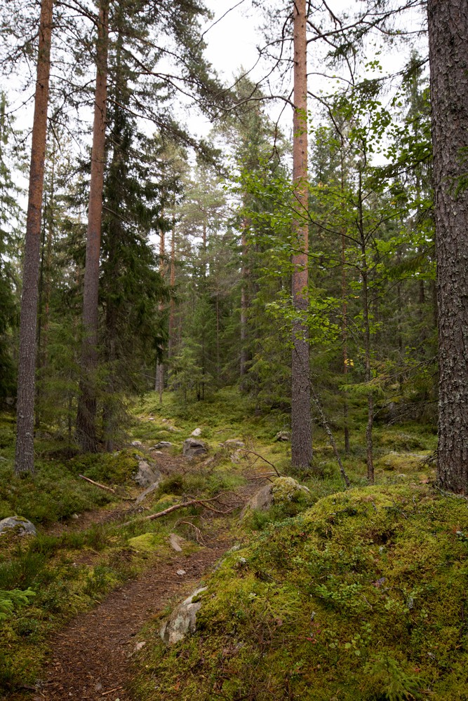 Le nez dans notre bol de chocolat, on peine à se décider ce matin là sur notre randonnée. Le guide prêté la veille est plein de promesses et nous finissons par opter pour le coup de cœur de Sylvia. Après quelques difficultés à trouver le point de départ, nous voilà à déambuler tranquillement au bord de l’eau, l’oreille tendue dans l’espoir de percevoir un élan, un castor ou n’importe quel autre animal. L’endroit s’y prêterait sans mal, loin de la route, au cœur de paysages variés et au calme absolu. Les nuances de vert, l’abondante mousse, les myrtilles et champignons colorés nous charment encore et toujours et, le long du chemin, on finit par comprendre la Suède. Loin des roadtrips agités, de notre boulimie de kilomètres, de sites à visiter et d’images incroyables à ramener, la Suède est tranquille. Pour la première fois, on rêvasse à des vacances plus au calme, dans une maison au bord de l’eau, quelque part dans une foret perdue, à des kilomètres des autres habitations. Un instant, on se surprend à envier ces voyageurs installés là pour des jours à parcourir la même foret, sans autre but que de s’émerveiller de choses plus simples et de laisser leur esprit vagabonder.
