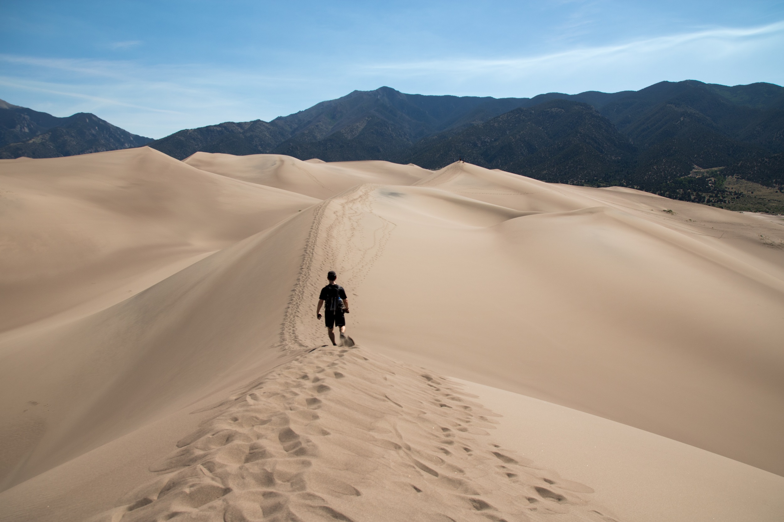 Great Sand Dunes a vraiment tout du mirage. Ces dunes majestueuses qui apparaissent au bout de la route semblent toujours irréelles. D’ailleurs, le sentier pour les gravir n’existe pas vraiment lui non plus. On suit les traces de nos prédécesseurs, peu nombreux à cette heure, et qui s’effacent déjà peu à peu. Le sable file sous nos pieds et entre partout dans les chaussures…