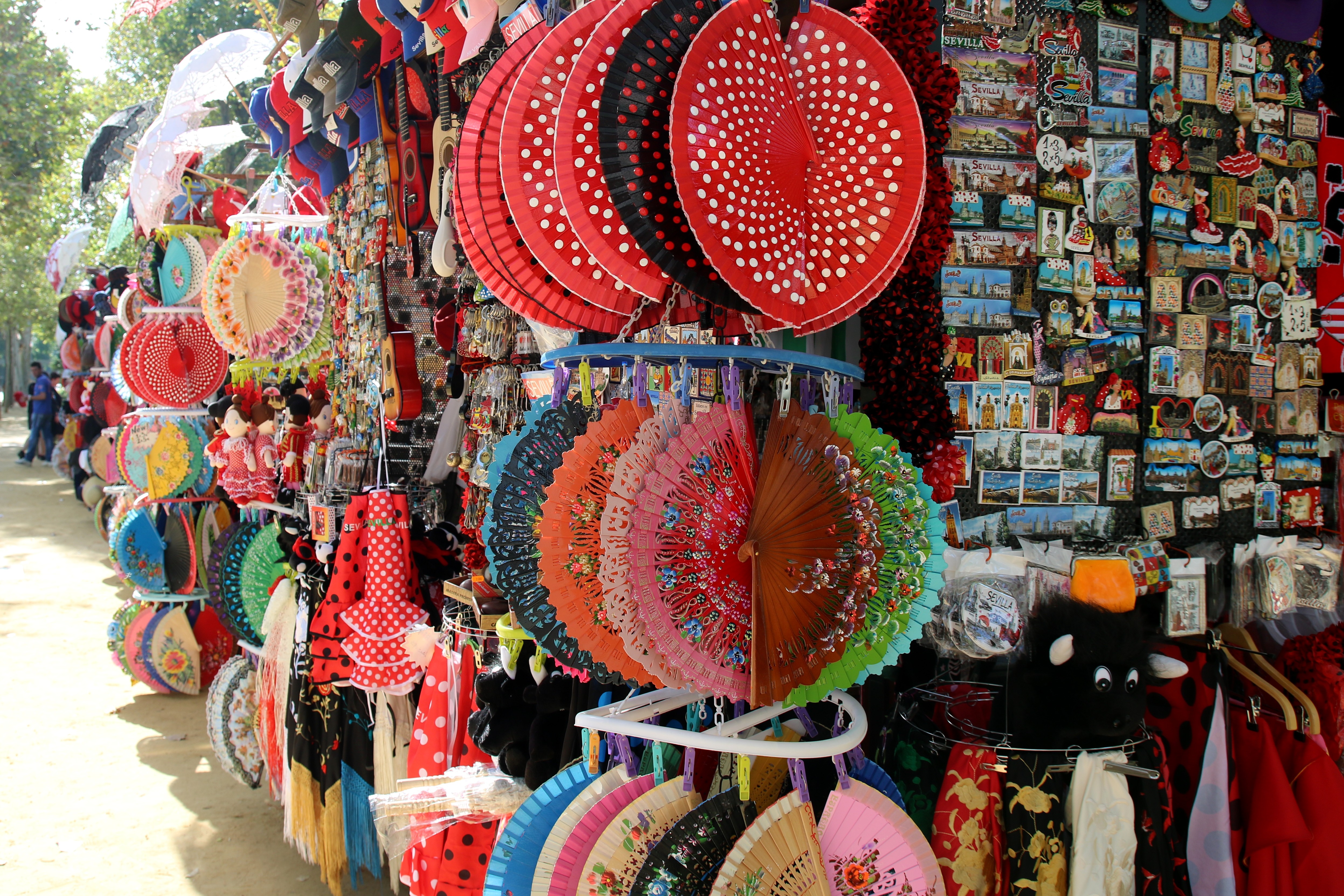 Tout près de la grande place, des kiosques débordent d’éventails colorés, de robes de flamenco et de gadgets rouges, or ou noirs. Dans les allées du parc, le calme règne au son des fontaines et à l’ombre des arbres centenaires.
