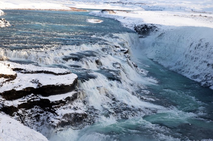 Au pied des chutes, des nuages brumeux emplissent un étroit canyon qui file vers les champs. la puissance de l’eau s’exprime en un incroyable vacarme au cœur de ces vastes étendues enneigées.