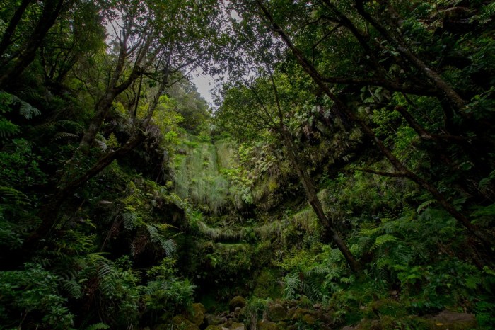 On se croirait au cœur de la jungle dans ce décor humide où les plantes sont reines. Fougère, mousses, fleurs et grand arbres se côtoient, se mélangent et envahissent tout. Tous les tons de vert semblent d’être donnés rendez-vous ici, au cœur de l’ile. Le doux murmures de levadas accompagne nos pas tandis que quelques cascades ponctuent le parcours. Sur les parois, la mousse luit sous les gouttelettes qui glissent lentement le long des fougères…