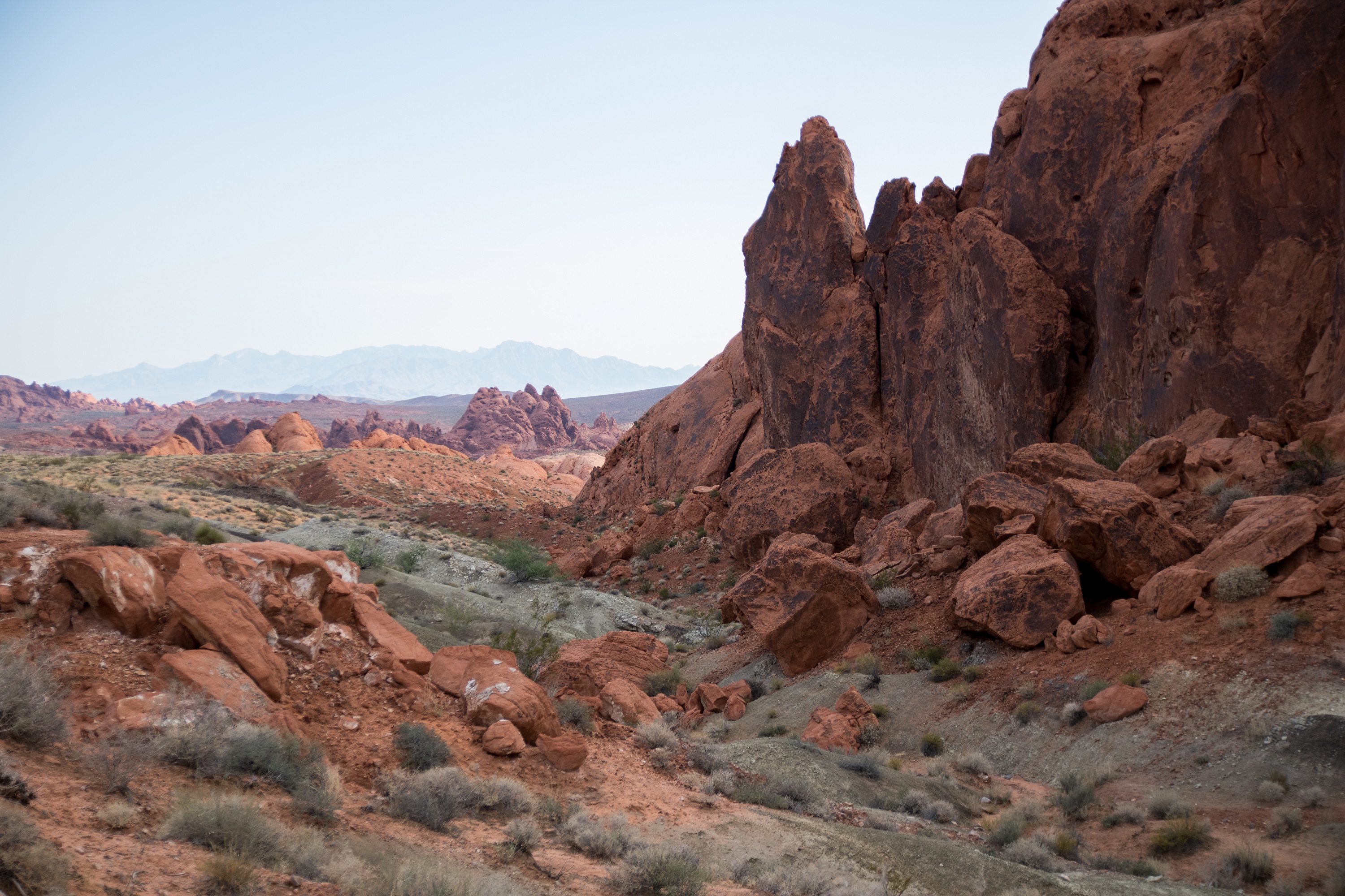 La scenic drive, comme toujours, est un spectacle de formes, de couleurs et d’ambiances. Le ciel arbore mille nuances, la route semble infinie et on sent déjà que cet endroit nous marquera. Les premiers pas se font les pieds dans le sable déjà chaud entre quelques arbustes et cactus. Le sentier disparait progressivement au profit de cairns disséminés dans la roche qui mènent sans effort à la vague colorée…
