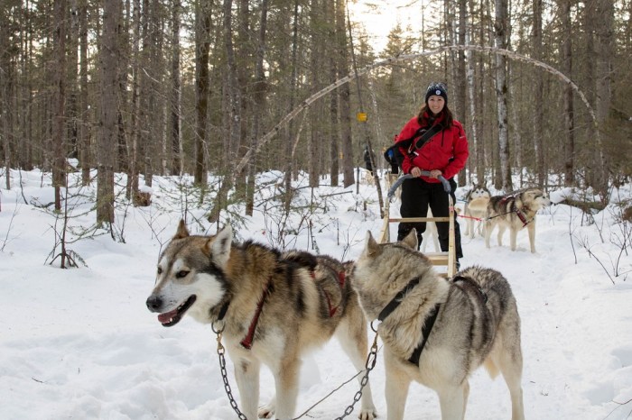 On glisse sur les sentiers enneigés, tractés avec douceur par nos huskys ou malamutes. On tournicote dans les arbres, à la file indienne, en silence. Le soleil nous accompagne sur la route et illumine les bois. En les quittant, les espaces entre les traineaux s’agrandissent, les attelages prennent de la vitesse. L’espace d’un instant, on vole…