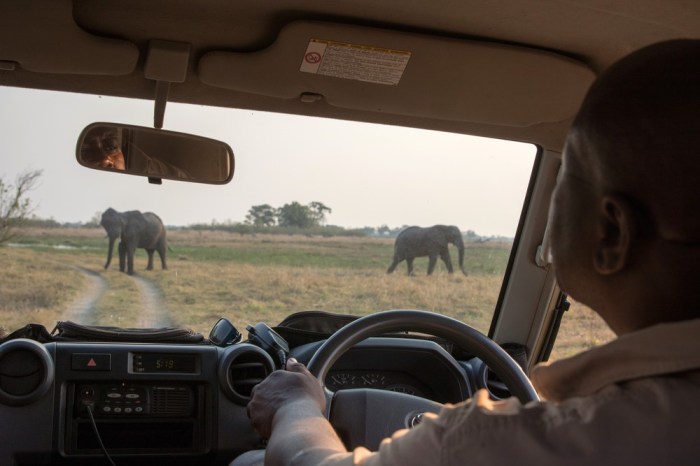 On approche des familles entières de près. De très près. On y voit d’ailleurs des dizaines de petits, de tous les âges. Sam en profite pour nous raconter de nouvelles anecdotes et distiller quantités de connaissances sur les pachydermes. On apprend à cette occasion que les éléphants sont droitiers ou gauchers : leur tendance se note à l’usure de leurs défenses, toujours plus marquée d’un côté. Notre guide en profite aussi pour tordre le cou à certains mythes comme les cimetières d’éléphants. La réalité est beaucoup moins jolie : ces gros mammifères ne se sont jamais rendus dans des lieux particuliers pour mourir. Le chercheur ayant émis cette théorie est simplement tombé sur une « planque » de chasseurs d’ivoire ayant laissé sur place toutes les carcasses des animaux braconnés. On aurait vraiment préféré croire à la première version.