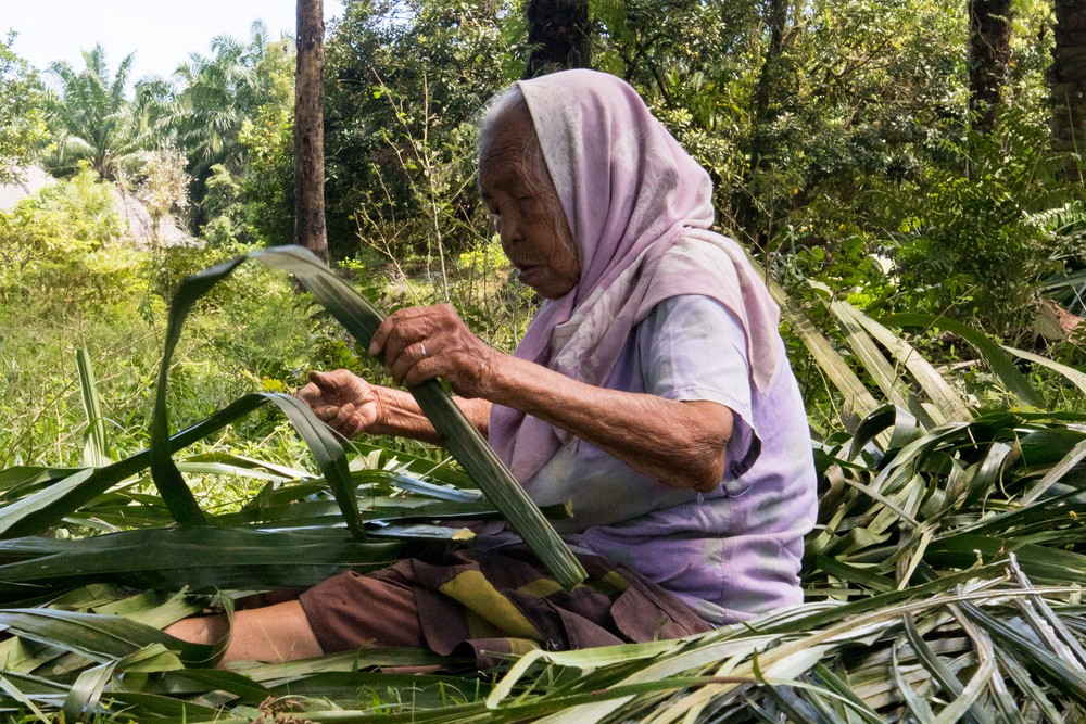 La balade se poursuit sur les chemins qui s’enfoncent dans la campagne, passant entre les productions de caoutchouc, de bananes, de cacao et de palme. Au milieu ont poussé des maisons un peu partout, certaines au bord de canaux, d’autres plus en retrait pour installer un jardin cultivé. Tout le long de la route, les enfants nous adressent de larges sourires, chantonnant quelques hello en agitant la main.