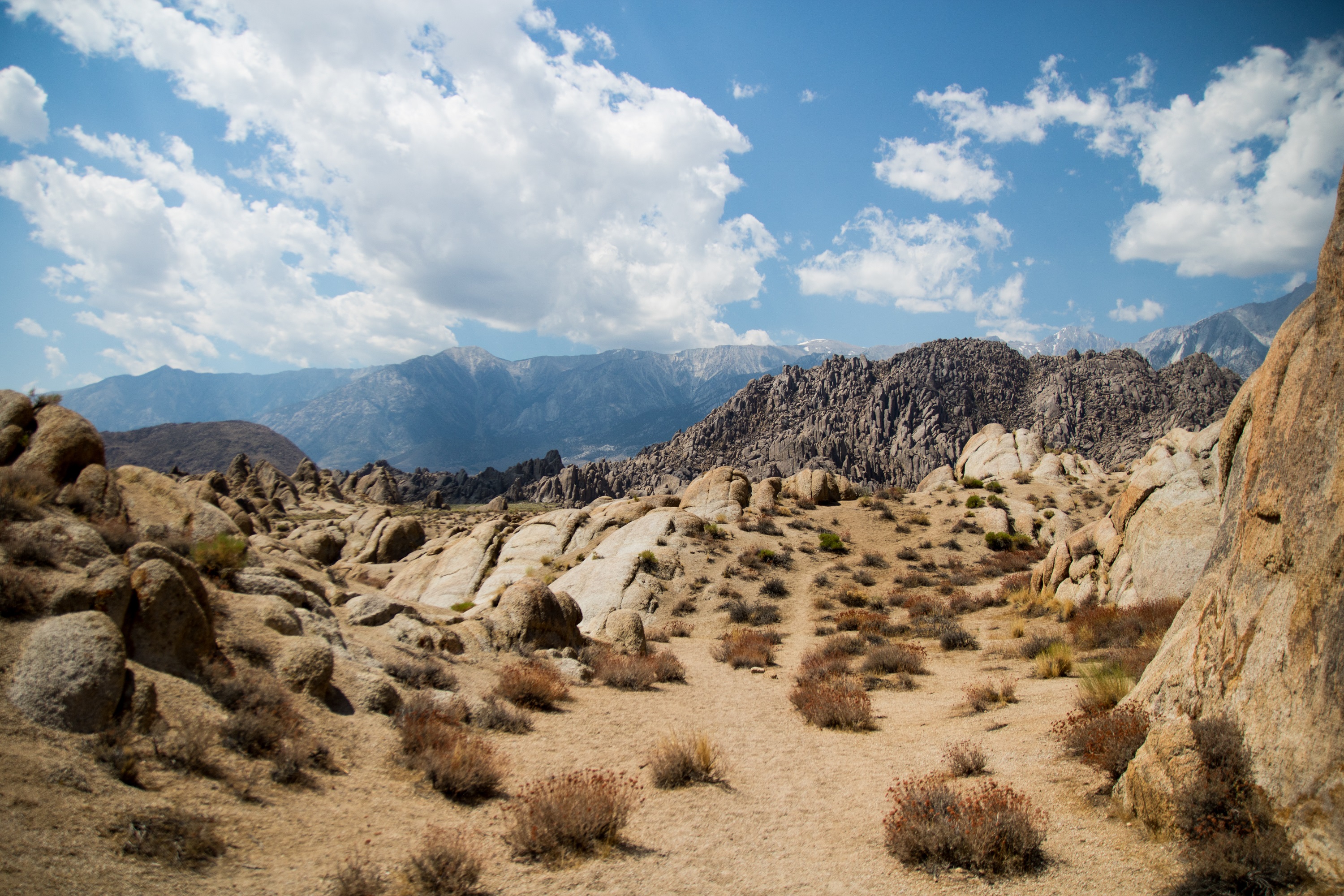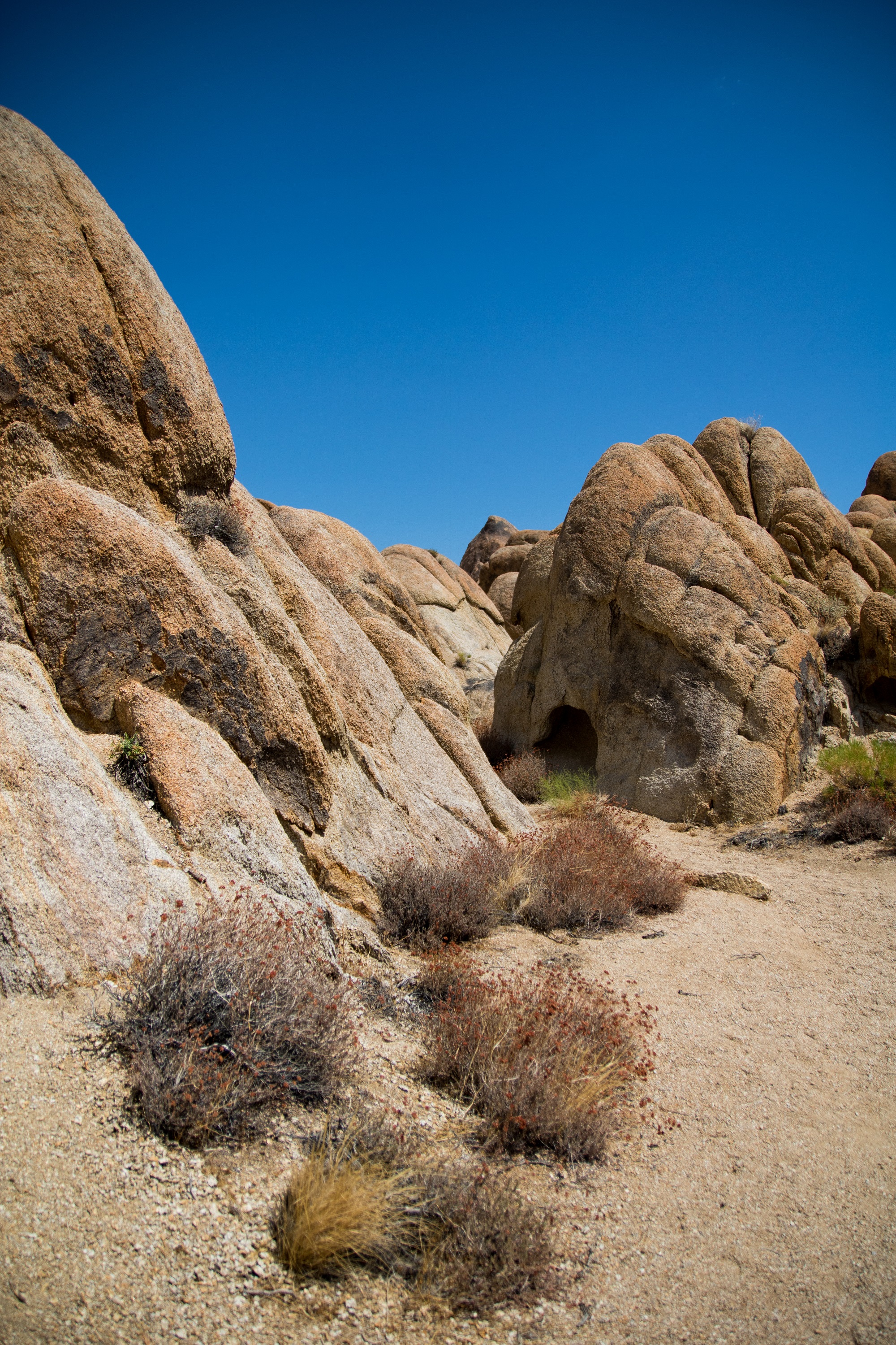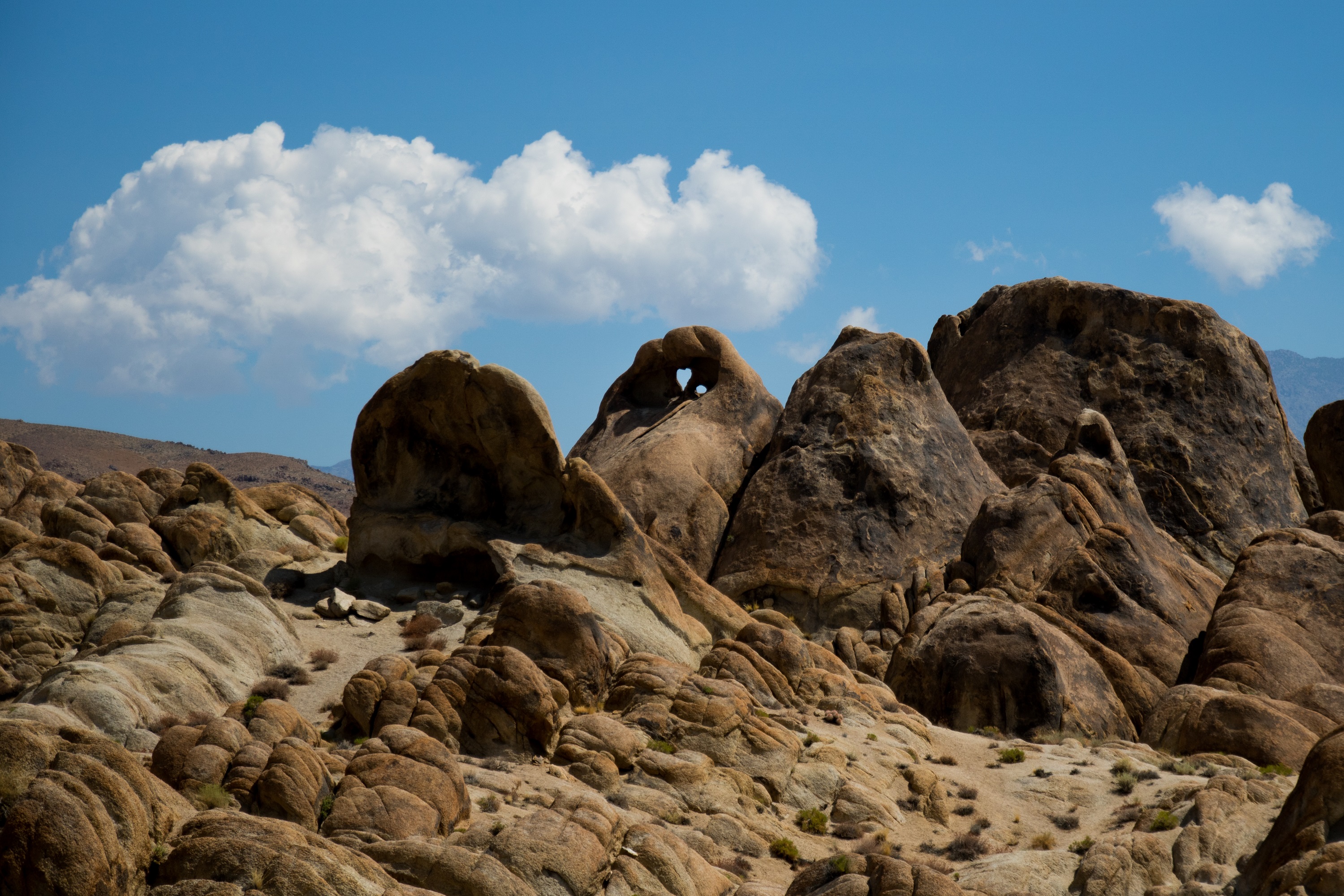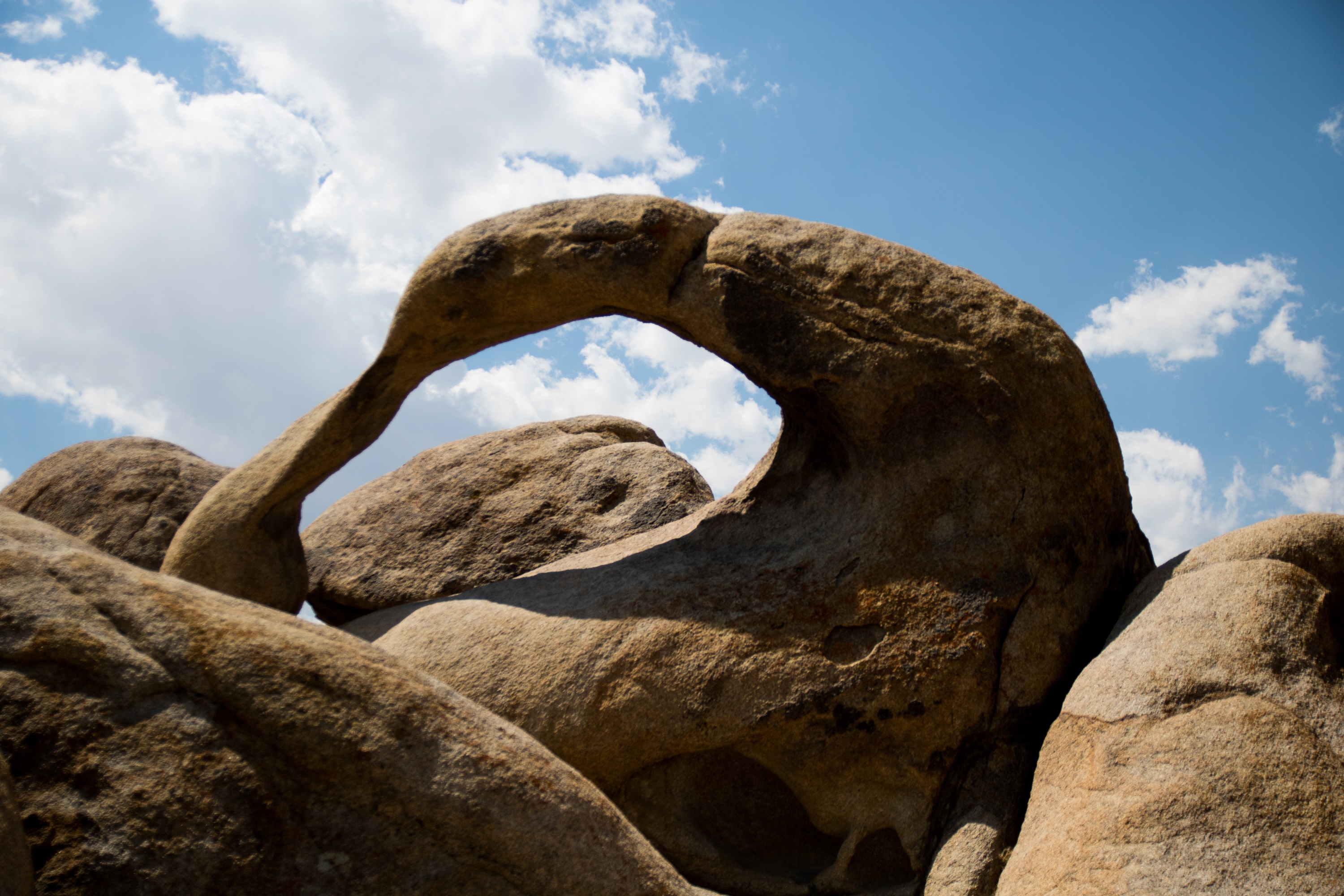 Entre la Vallée de la mort et le Yosemite, les monts enneigés fendent le ciel bleu entachés de quelques nuages. Près de Lone Pine, les Alabama hills paraissent abandonnées du reste du monde. Terre de western aux airs de Joshua Tree, ce paysage rocailleux tout en rondeur nous accueille pour une courte balade où nous ne sommes, une fois encore, pas dérangés par la foule. L’endroit est réputé pour avoir servi de décors à des centaines de films de cowboys et de ruées vers l’or et on découvre cet univers de contraste et de couleurs sur quelques kilomètres à peine. Quelques arches se dissimulent ici ou là au détour d’un virage ou au hasard d’un regard.