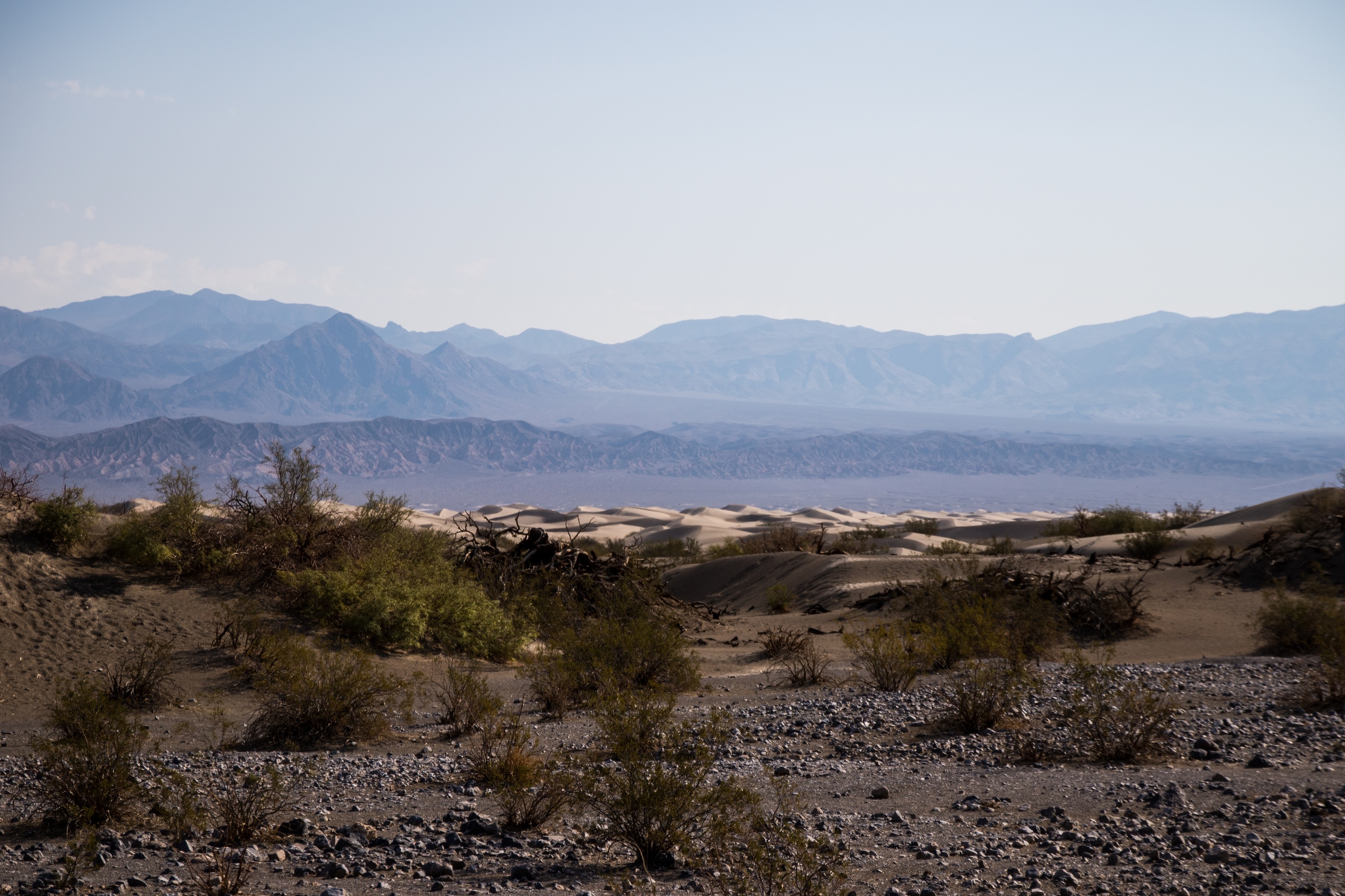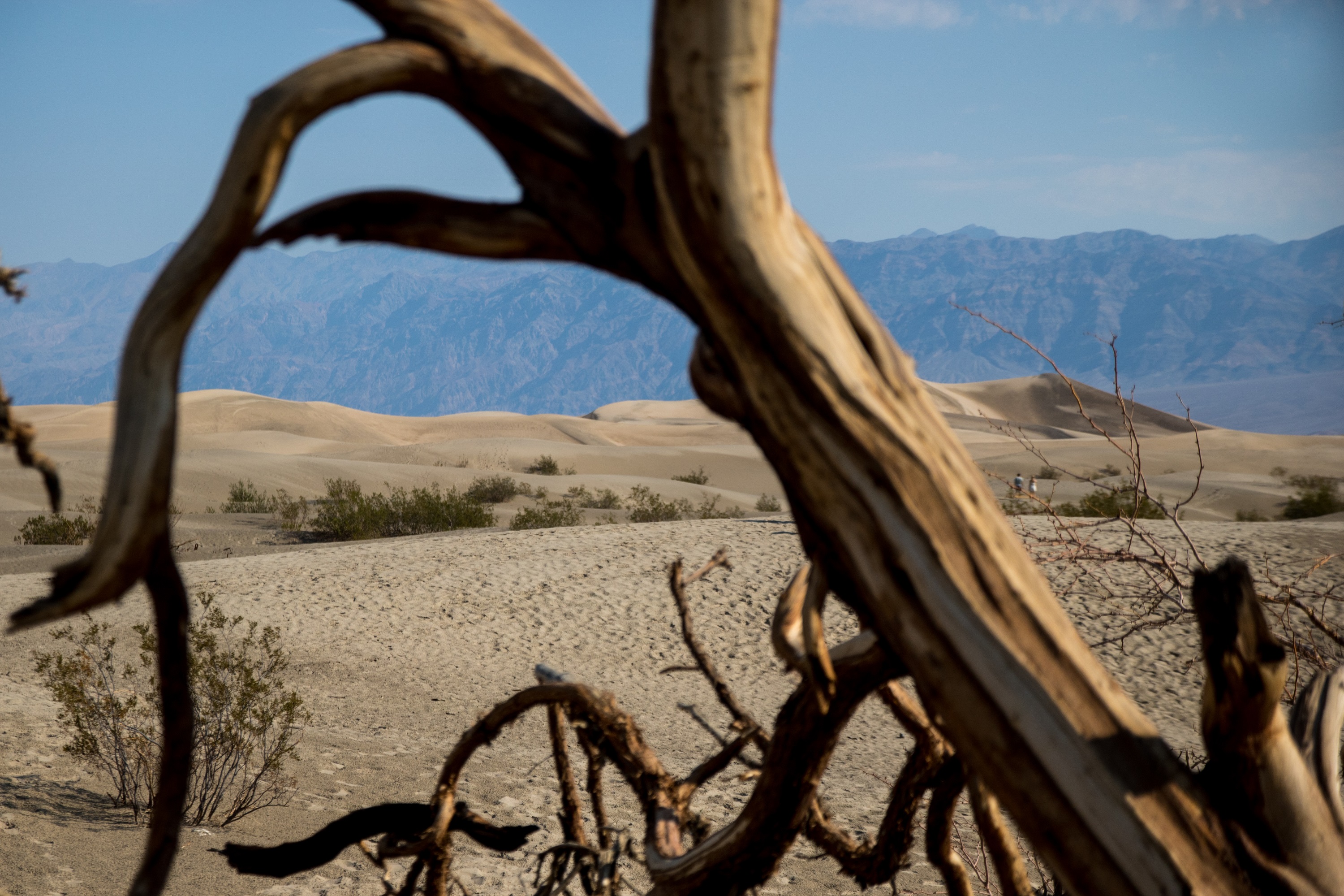 Le soleil se lève sur Death Valley et réchauffe dès le matin une atmosphère qui, à la réflexion, ne s’était pas vraiment refroidie. Il est encore tôt et une légère brume semble, par endroit, flotter au dessus du sol. A deux pas de l’hôtel, d’intrigantes dunes de sables se laissent finalement découvrir. Dans la nuit noire de la veille, on aurait été bien incapable de les distinguer. Les dunes dansent devant les montagnes alentours, déjà maculées de traces de pas. On n’ose finalement pas s’aventurer bien loin, un peu inquiets de cette chaleur et de toute la route prévue aujourd’hui. On savoure simplement la découverte d’un paysage que beaucoup n’avaient encore jamais vu. Death Valley est décidément riche de surprises.