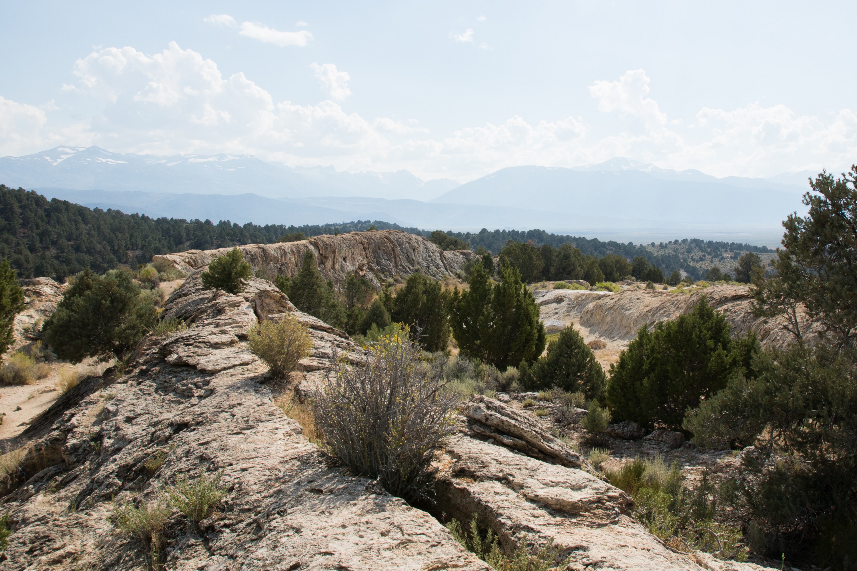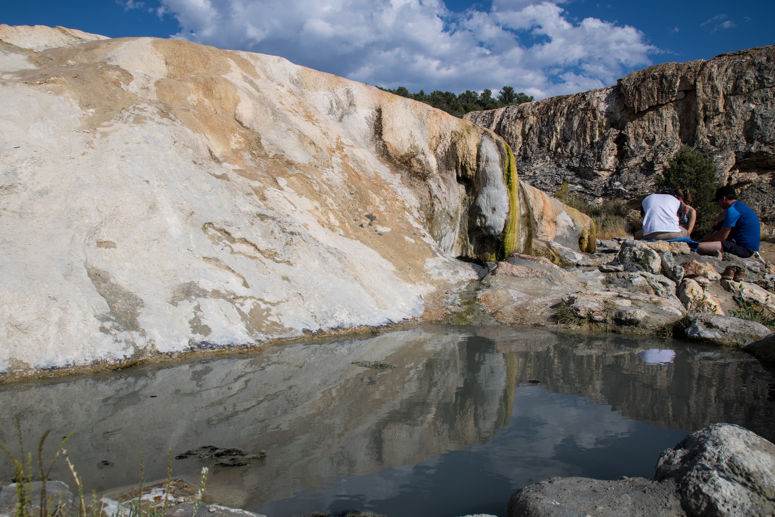 La route tournicote jusqu’aux Travertine Hot Springs, à peine signalées par un parking recouvert de poussière. Armés de maillots et de serviettes, on tombe rapidement sur le premier bassin, tout petit et déjà occupé par un vieux monsieur uniquement vêtu d’un chapeau. Il nous adresse un geste et un sourire sympathique qui ne nous encourage pas pour autant à venir partager cet espace étroit. Le second point d’eau forme trois petits bassins où pataugent quelques gamins. Par curiosité, on pousse jusqu’au troisième dissimulé dans les broussailles. Celui ci aussi est occupé par un vieil homme à la peau tannée par le soleil qui a choisi de remplacer le Stetson par une bière (pour le reste, on a pas voulu vérifier…). On retourne finalement au deuxième point d’eau et, par chance, nous sommes seuls au bout de quelques minutes. L’eau chaude détend tous les muscles sollicités ces quinze derniers jours et procure une douce sensation de bien être. Assis dans nos bassins avec vue sur les sommets de la Sierra Nevada, on savoure l’instant. Un guitariste arrive finalement armés de ses trois mots de français et monte se percher sur la roche. Quelques accords brisent le silence et précèdent une douce chanson folk.