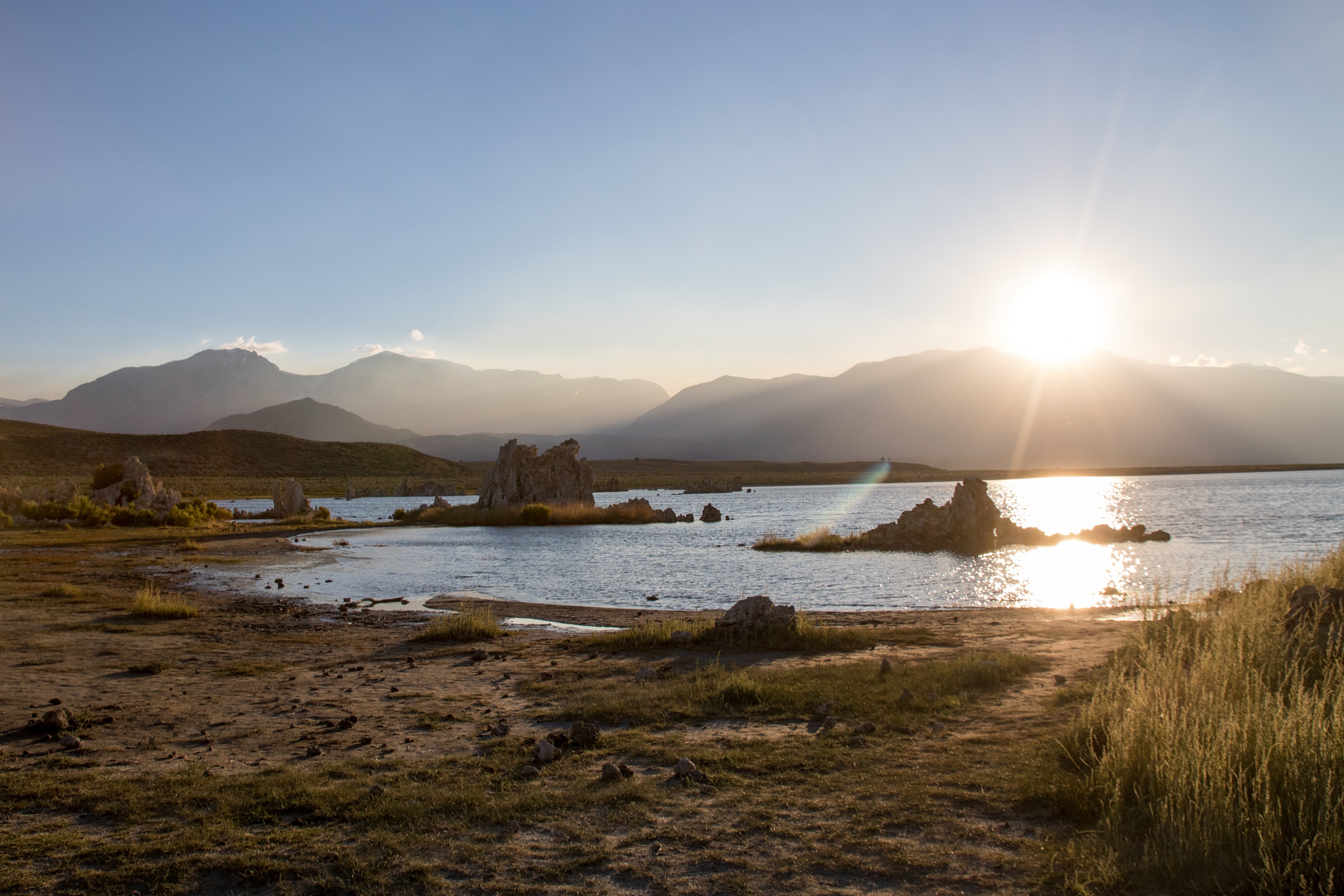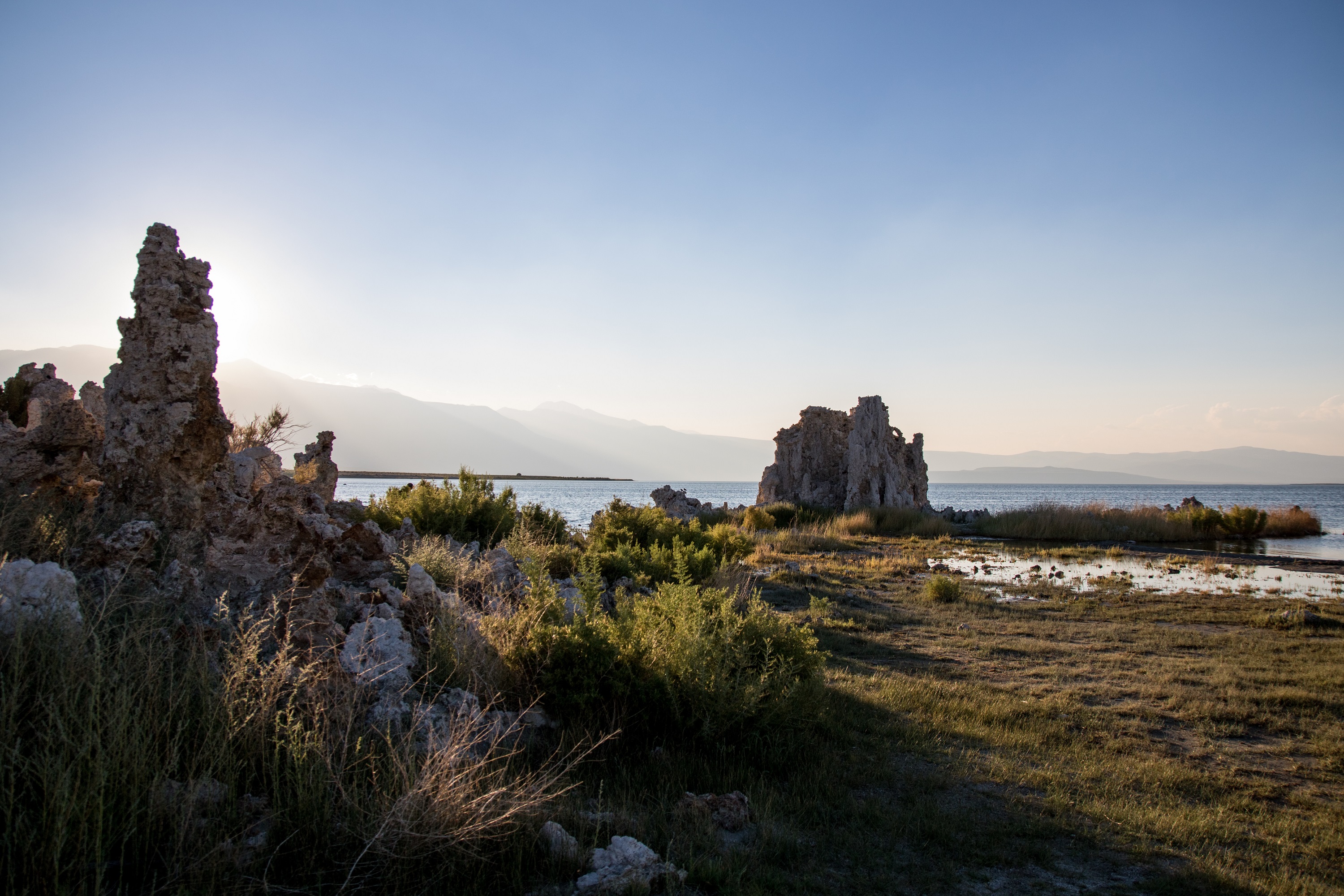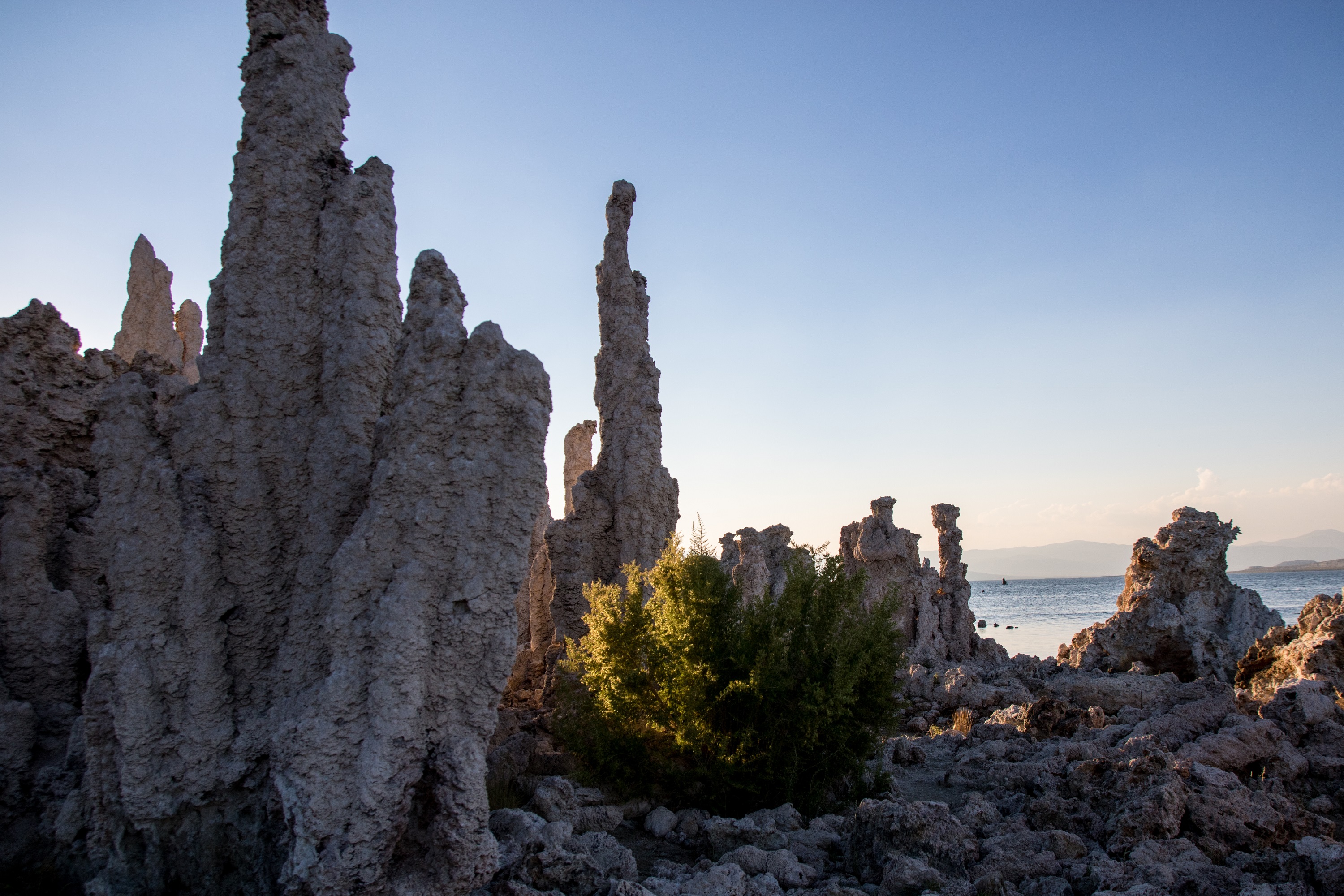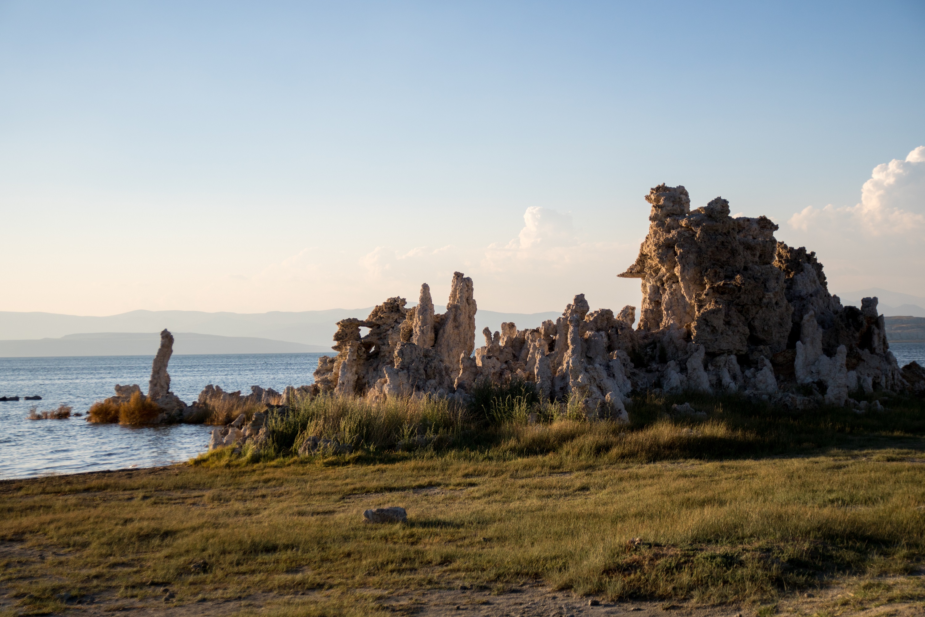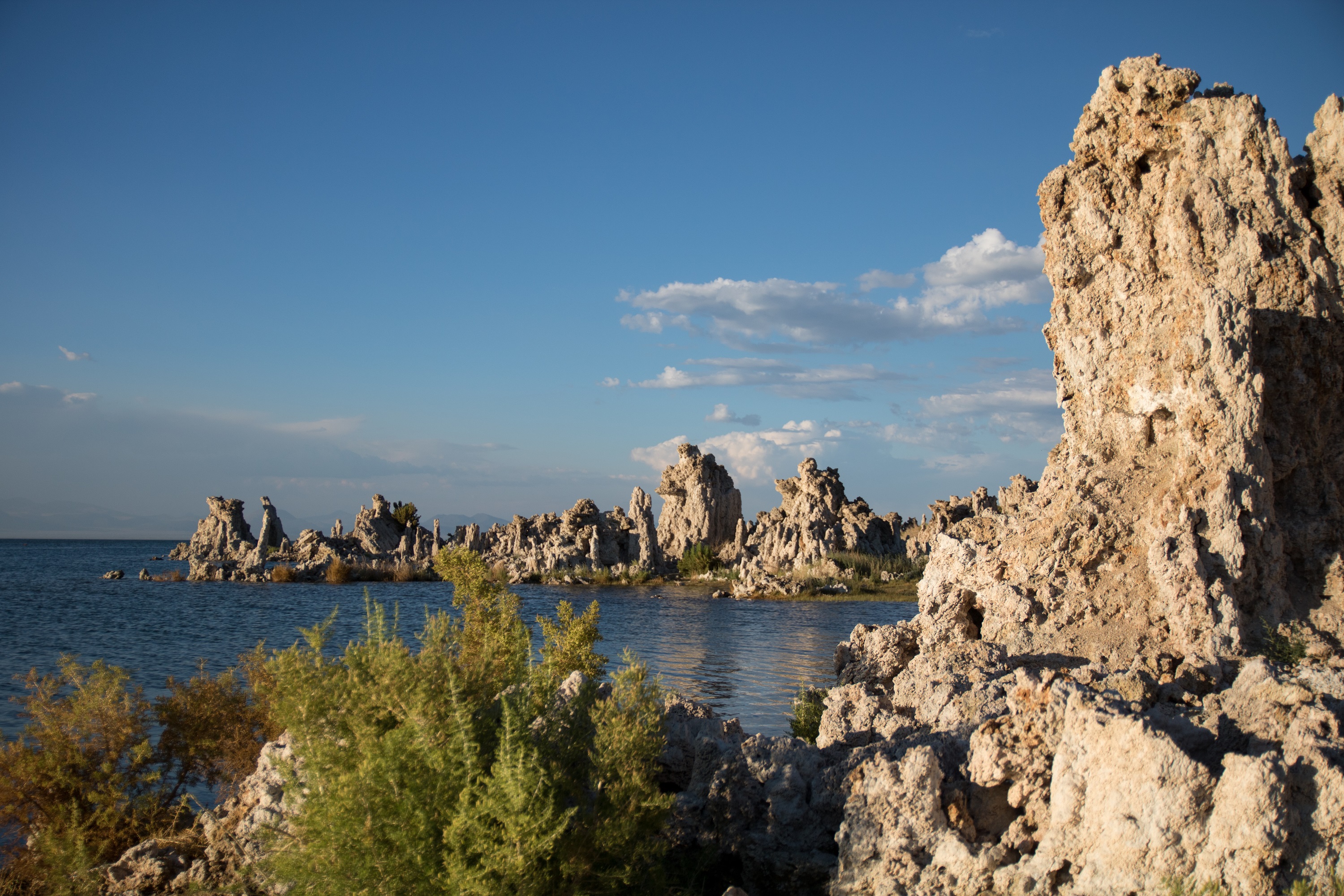 Notre dernière session de voiture pour la journée nous ramène vers les bords du Mono Lake où la lumière prend des tons plus doux. Ce grand lac d’eau salée héberge d’étranges cheminées blanches figées au bord de l’eau. Les tuffas, concrétions calcaires, sont accessibles par un petit chemin qui longe le lac avant de serpenter dans des grands buissons fleuris. Les mouettes volent au dessus de nos têtes, au revoir le désert.