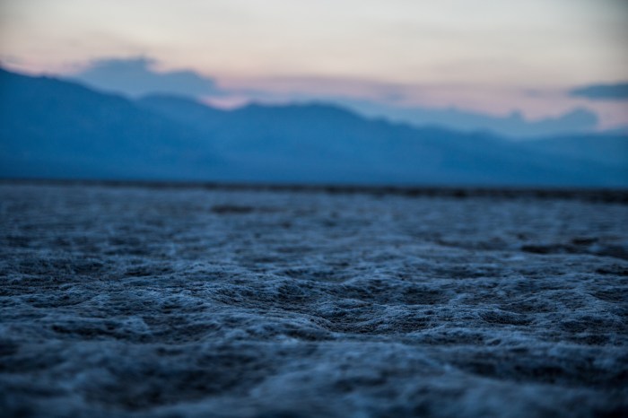 Le soleil se lève sur Death Valley et réchauffe dès le matin une atmosphère qui, à la réflexion, ne s’était pas vraiment refroidie. Il est encore tôt et une légère brume semble, par endroit, flotter au dessus du sol. A deux pas de l’hôtel, d’intrigantes dunes de sables se laissent finalement découvrir. Dans la nuit noire de la veille, on aurait été bien incapable de les distinguer. Les dunes dansent devant les montagnes alentours, déjà maculées de traces de pas. On n’ose finalement pas s’aventurer bien loin, un peu inquiets de cette chaleur et de toute la route prévue aujourd’hui. On savoure simplement la découverte d’un paysage que beaucoup n’avaient encore jamais vu. Death Valley est décidément riche de surprises.