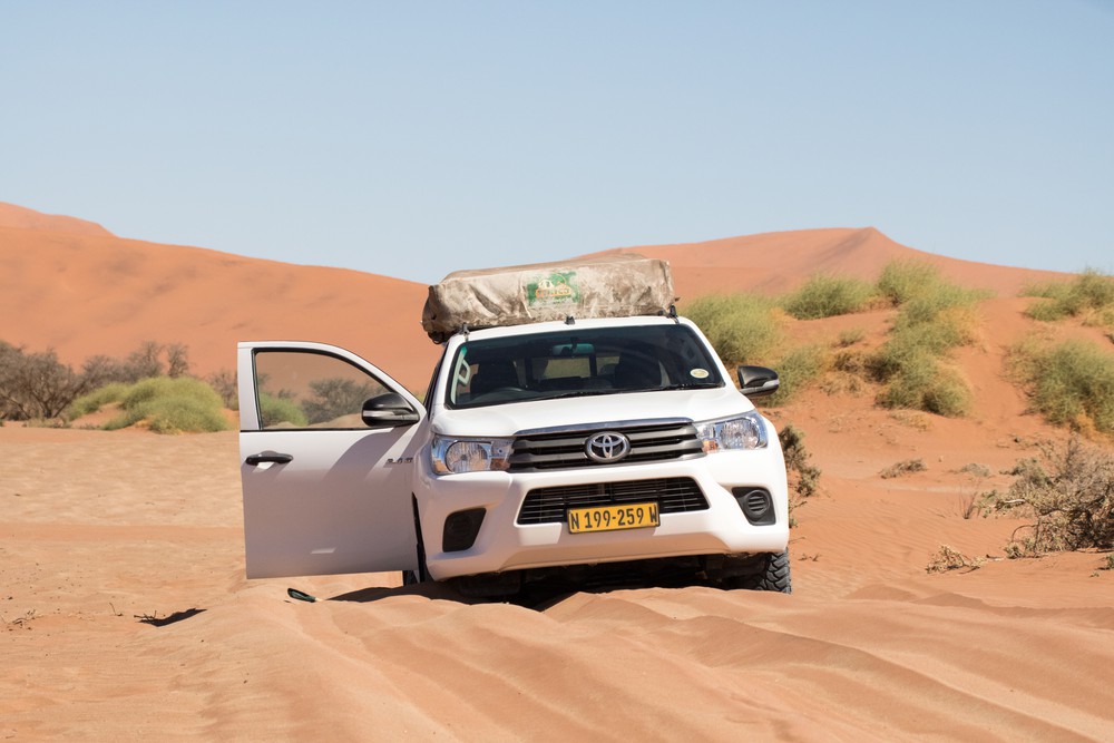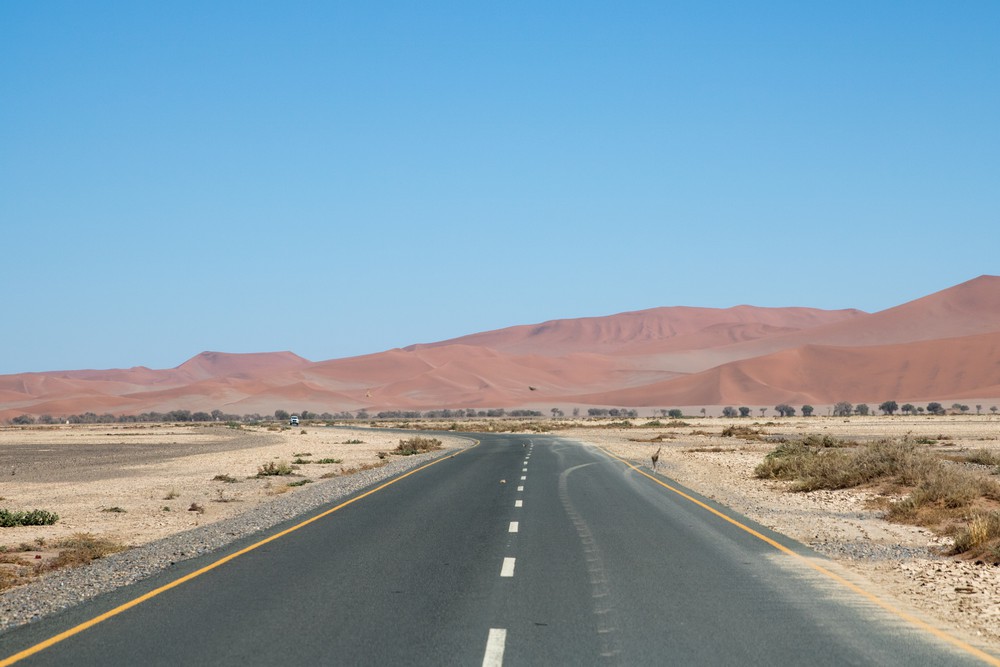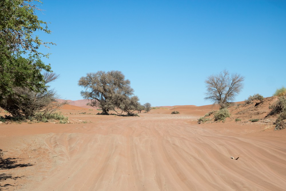 Si le début du chemin n’a rien de très exotique, on arrive rapidement à une portion de route couverte de sable où dégonfler les pneus devient indispensable. L’espace d’un instant, entourés de tout cette poudre orangée, on repense à notre aventure en Namibie où nous étions restés ensablés pendant des heures… Ces couleurs flamboyantes sont en réalité dues à du fer présent en quantité sur la côte de Shark Bay, au dessus de Denham.