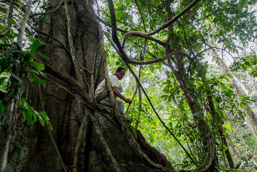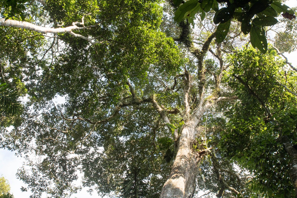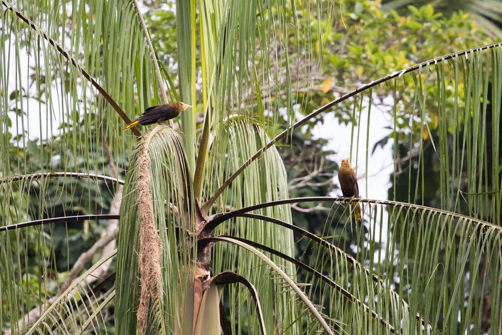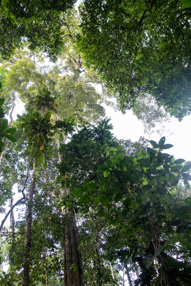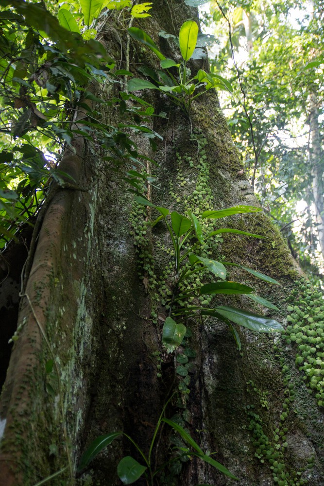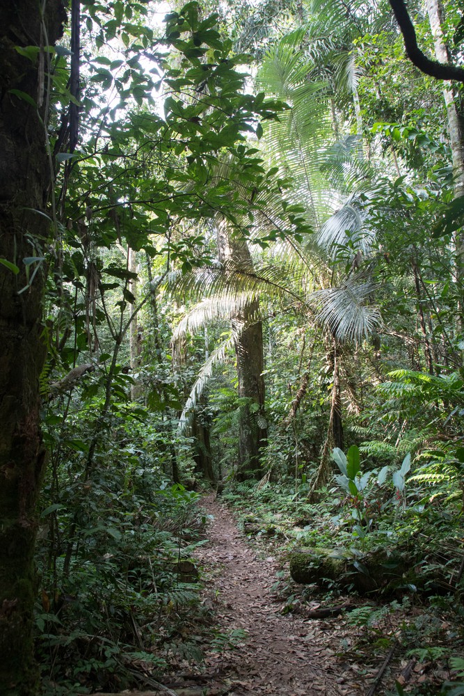 Le lendemain matin, nous partons pour une longue randonnée à travers la forêt. De petits sentiers de terre tournicotent entre d’immenses arbres dont on peine parfois à distinguer clairement la cime. Au bout d’une demi-heure, on est bien incapables de retrouver la direction du lodge. De longues lianes pendent sur les troncs, le sol est couvert de feuilles et, parfois, de gigantesques rameaux de palmier défraichis. On se sent minuscules aux pieds de ce gracieux monde végétal.