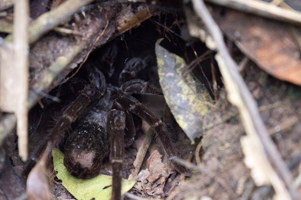 Nous voilà donc à la file indienne, frontale vissée sur la tête, engagés sur un chemin qui serpente dans la nuit noire. On croise nos premières araignées, grenouilles et autres phasmes et on finit par se détendre (tout en continuant à bien rester collé au reste du groupe). Quand Léo nous propose d’agiter un petit bout de bois devant un trou creusé dans le sol, on reste quand même un peu méfiants… chacun observe son voisin en attendant de savoir qui sera la victime, un peu comme une classe de primaire avant d’aller réciter une poésie. Puis finalement, notre guide prend les choses en main. Il agite son bâton quelques secondes… juste assez pour faire sortir une tarentule toute noire et velue. On rentrera finalement sans encombre, sans avoir croisé de grosses bêtes ou s’être faits manger par un anaconda. Le sommeil nous gagne vite et d’autres aventures nous attendent au réveil.