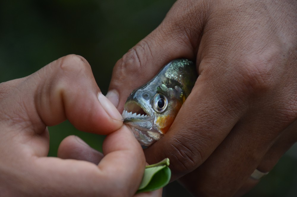 On sort finalement des bois pour gagner un grand lac bordé de palmiers. En silence, on s’installe à bord de barques à fond plat et on rame, doucement. Ici vivent caïmans et anacondas, singes et oiseaux de toute sorte. On les cherche, longtemps, sans succès. Des pluies diluviennes se sont abattues sur l’Amazonie quelques jours avant notre arrivée, rafraichissant nettement l’atmosphère et encourageant les animaux à se dissimuler dans les arbres. On le sait, approcher la faune sauvage requiert une bonne dose de chance et de patience. Cette fois, la chance nous aura manqué. On aperçoit seulement quelques aras entre les branches de palmiers. Au cours de la balade, Léo nous propose une nouvelle expérience: la pêche au piranha. Vaillamment armés d’un fil de nylon et d’un bâton, on tente… et ça marche (une fois, la première: plus jamais on ne réussira !). Léo attrape cet étrange petit poisson et nous montre son impressionnante mâchoire avant de le laisser filer rejoindre sa bande. Il est désormais temps de rejoindre le lodge, ses hamacs et nos petites cabanes.