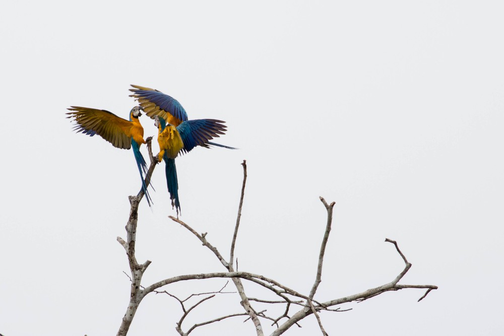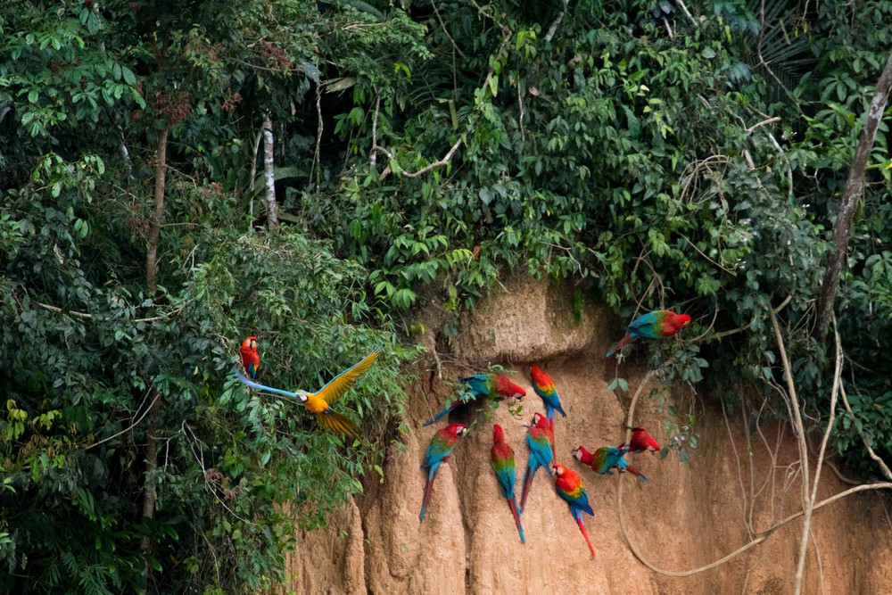Ici, aras et perroquets viennent tous les matins pour grignoter la falaise dans un curieux ballet. L’argile agit comme un pansement gastrique et protège les oiseaux de l’acidité des fruits qu’ils peuvent trouver dans la forêt. Tout est très réglé : les oiseaux s’installent par familles et par espèces dans les arbres tout autour de la falaise et attendent. Si l’endroit est calme, une partie du groupe descend gratter l’argile, l’autre surveille les alentours. Les espèces se succèdent, se mélangent rarement et chaque groupe picore pendant quelques moments, faisant de nombreux va-et-vient entre arbres et falaise.