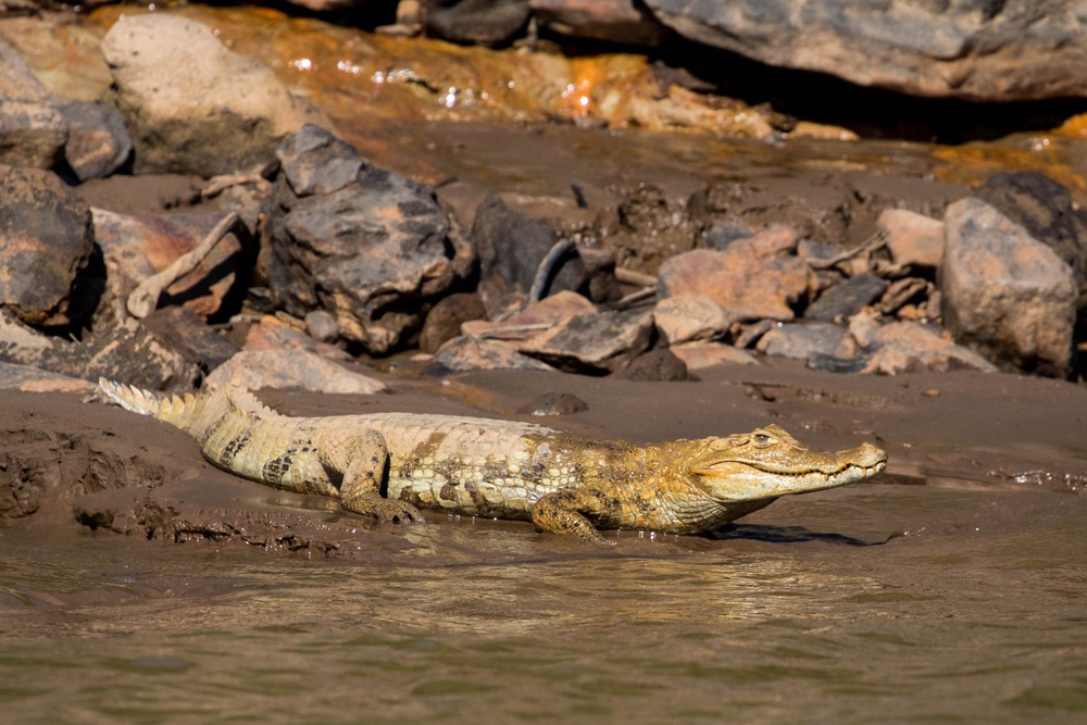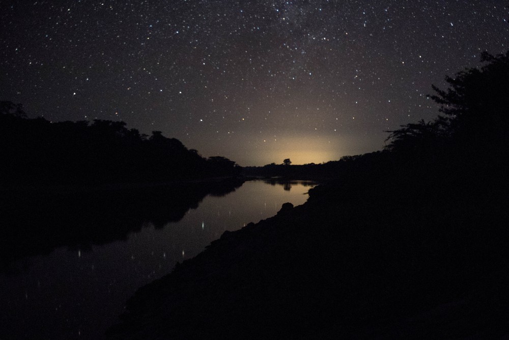 Quand on nous tire du lit ce matin là, il fait nuit noire dehors. Il est incroyablement tôt et on met machinalement un pied devant l’autre jusqu’au bateau. Léo nous explique alors le plan: remonter la rivière de nuit, sans lumière pour ne pas déranger la faune, entre les rapides et les blocs de pierres qui parsèment la rivière. Aucun risque selon lui, notre pilote connait la rivière comme sa poche. Non, ce n’est toujours pas une blague.