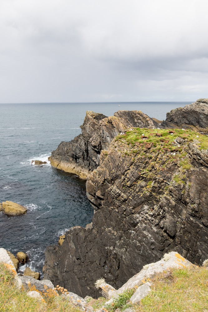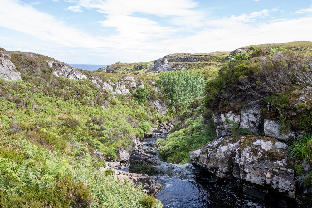 Après avoir laissé la voiture sur un bas-côté, on part à pied sur le sentier, traversant des landes de bruyères et de mousses tout en gardant un œil sur la mer. On pousse sur quelques kilomètres jusqu’à une petite cascade avant de rebrousser chemin mais le chemin semblait continuer encore sur une longue distance !