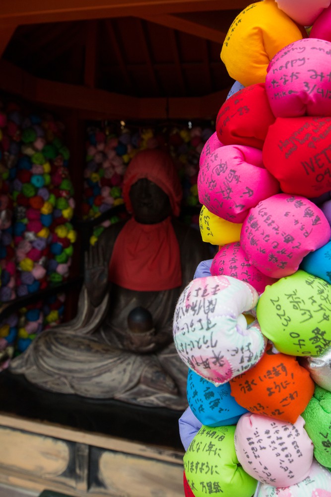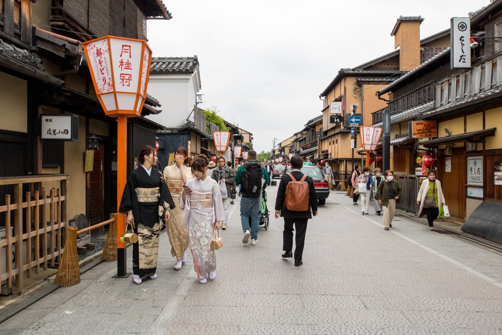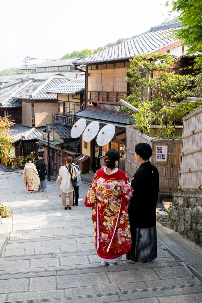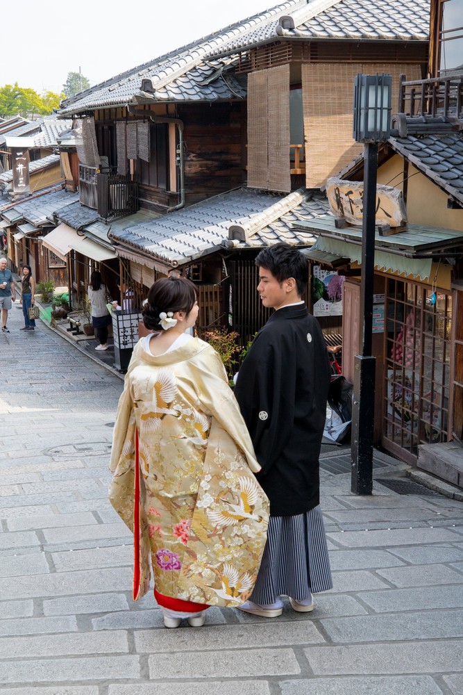Alors que les échoppes n’étaient pas encore ouvertes, on a eu la joie de remonter les rues étroites seuls ou presque, pouvant ainsi profiter du décor en toute sérénité. Le temps de notre balade, nous avons rencontré par hasard trois couples en pleine séance photo, l’occasion d’admirer de plus près le détail des kimonos colorés.