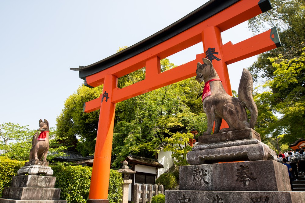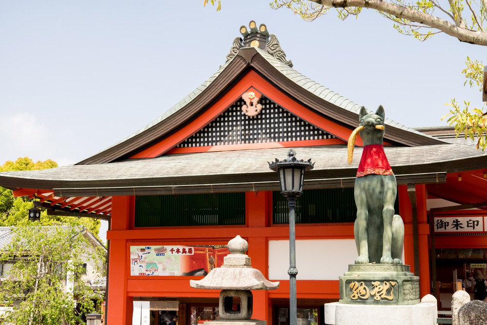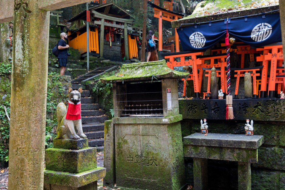 Comme les autres, on tient à notre photo typique de cet impressionnant alignement de bois vermillon à travers lequel passent quelques rayons du soleil. La photo faite, on grimpe tout de même jusqu’au sommet du sanctuaire, le long d’un chemin de randonnée qui s’étend sur quelques kilomètres dans une ambiance plus ombragée et plus tranquille. On y trouve tout un tas de sculptures et de représentation de renard, messager d’Inari dans la tradition locale. Certaines sont habillées de rouge, d’autres envahies par une mousse au vert vif.