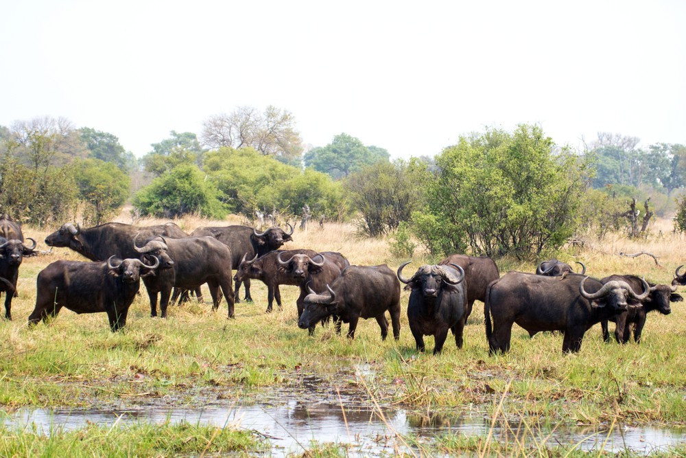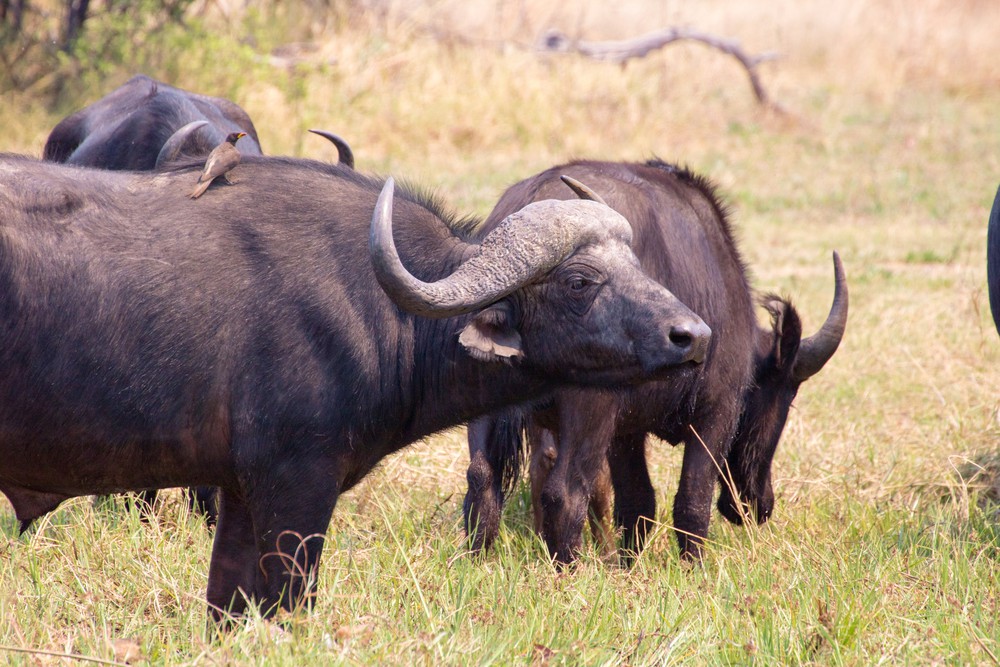 Le buffle d’Afrique (Syncerus caffer) et ses quelques 700kg vit en larges troupeaux dans des zones boisées. ses cornes peuvent atteindre 1,5 mètre d’envergure. Celles des mâles recouvrent le haut de sa tête, contrairement aux femelles.