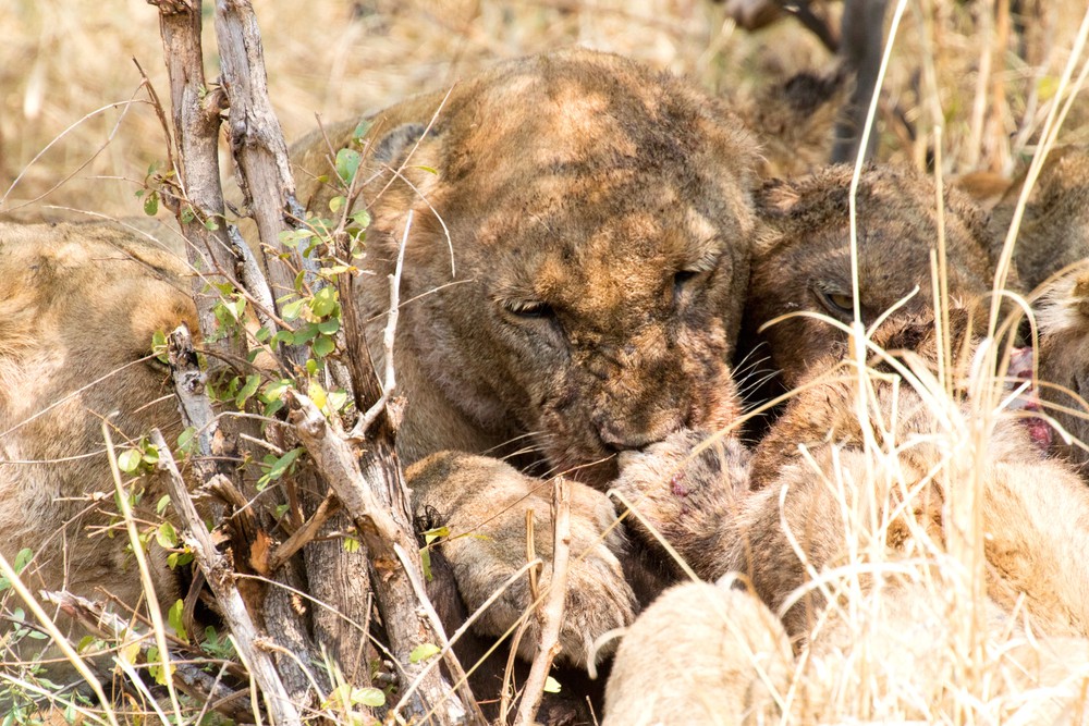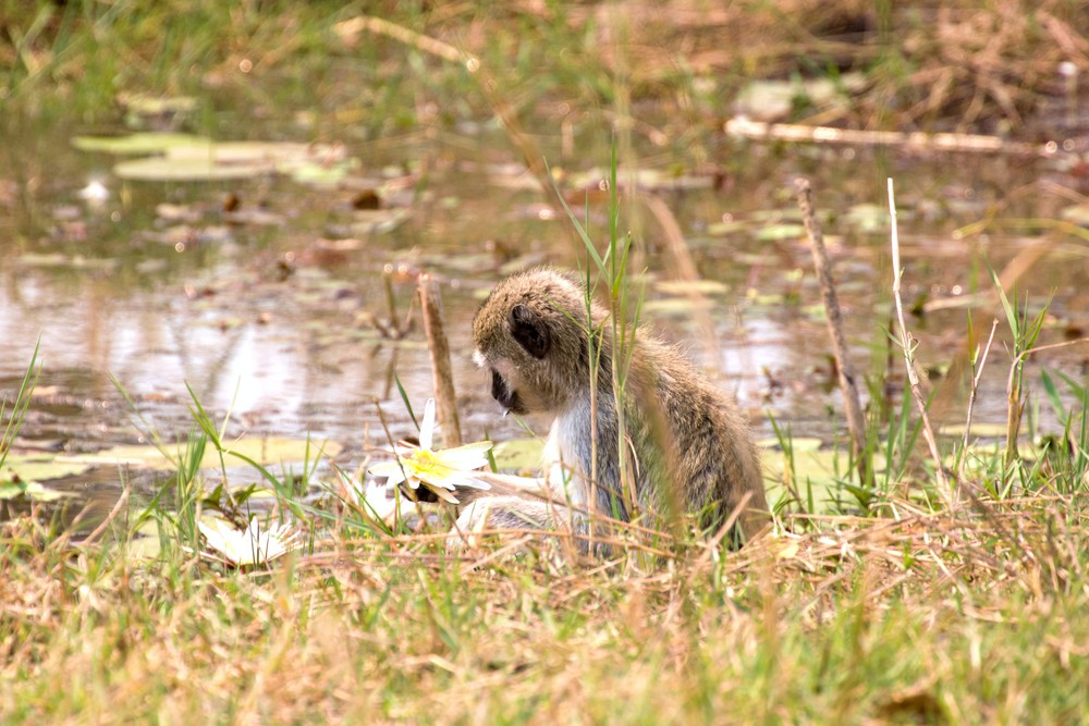 A proximité, une immense famille de babouins traine sous les arbres. Ils sont près d’une cinquantaine, fouillant le crottin d’éléphants à la recherche de fruits et de noix, arrachant des touffes d’herbes ou courant entre les pattes des antilopes. S’ils ne nous ressemblent pas autant que les grands singes, ils ont tout de même un nombre impressionnant de mimiques, de comportements et d’habitude qui nous interpellent. Les mères qui serrent les jeunes contre leur cœur, les échanges de regards, les bêtises des petits et les réprimandes. On craque surtout pour leur bouille d’elfe avec ces grandes oreilles roses disproportionnées.
