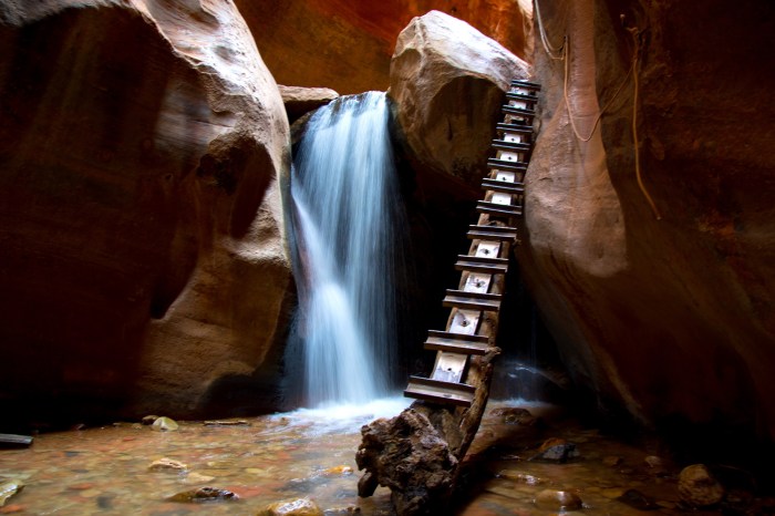En à peine une heure, le chemin devient plus étroit et les premières falaises rosées apparaissent. Les slot canyons ont un petit quelques chose de magique, on y avance une main courant sur la pierre polie par l’eau et le vent, intrigués par chaque virage, émerveillés par le jeu des lumières sur la roche. Un vent frais court au dessus de l’eau, portant les voix des randonneurs bientôt couvertes par le bruit des cascades. La première, sans doute la plus connue et la plus photographiée, se dresse soudain devant nous. Un rondin de bois et un bout de ficelle ont été installés en guise d’échelle et permettent de poursuivre la randonnée une fois arrivés au sommet. Pour certains, ce passage relève carrément de l’expédition: on croise une famille avec un porte bébé sur le dos que l’on regarde descendre le long de l’eau avec inquiétude…