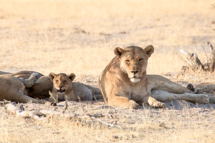 Le soleil décline rapidement et le parc prend de jolies nuances dorées sur le chemin du retour. La grande route toute droite qui permet de regagner Ngepi est calme et aucun animal ne semblait décidé à apparaitre pour clôturer la journée. Alors qu’il ne restait que quelques kilomètres, une famille de babouins a finalement décidé de venir nous saluer ! Un adulte d’abord, puis deux, puis de petits groupes avec des jeunes accrochés à leur maman. Le grand mâle reste au bord de la route et semble surveiller que tout se passe bien tout en comptant ses troupes. Il ne rejoindra les arbres que quand toute sa famille aura traversé la route.
