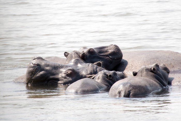 Le bruit des hippopotames se fait toujours entendre. Ils paraissent nettement plus près. On se décide alors à partir à leur recherche en remontant la route. Toute une famille roupille là, à quelques mètres de la berge. On s’approche avec prudence, dissimulés entre palmiers et roseaux. Leur air de vache est trompeur et ces grosses bêtes sont bien plus rapides que nous, dans l’eau comme sur la terre ferme. On évite donc de les contrarier. Malgré cette réputation d’animal agressif, on les trouve plutôt paisibles voire même carrément mignons quand petits et grands dorment les uns sur les autres, un semblant de sourire sur le museau.